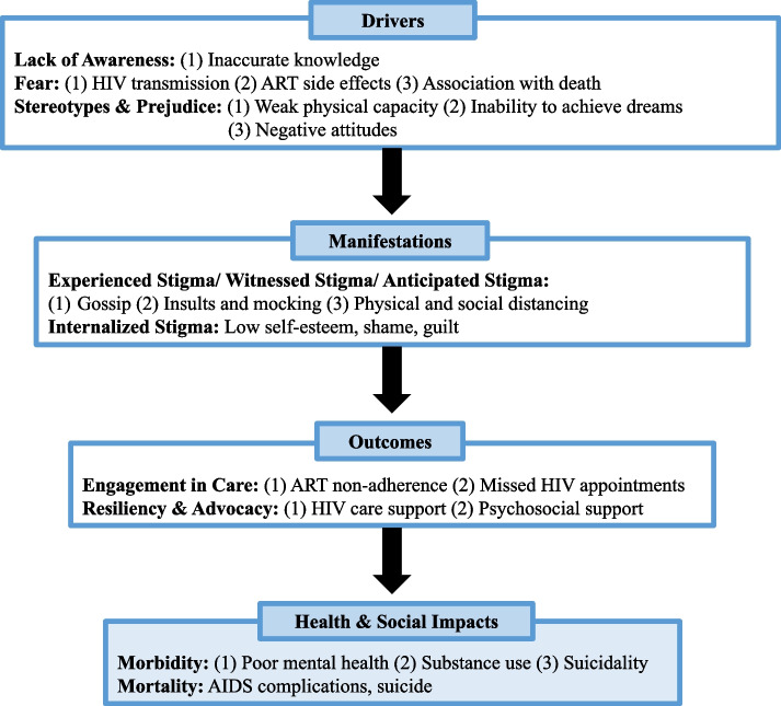 Results: Major drivers of HIV stigma included fear of HIV transmission, negative effects of antiretroviral therapy (ART), association with death, inaccurate knowledge, and negative attitudes towards ALWH. The most common manifestations of HIV stigma were gossip, insults and mocking, and physical and social distancing. Decreased ART adherence and missed HIV appointments were commonly cited outcomes of HIV stigma. Broader health impacts of HIV stigma were notable for mental health comorbidities including depression, anxiety, substance use, and suicidality. Identified resilience strategies included support for HIV care engagement and psychosocial support from family and friends.