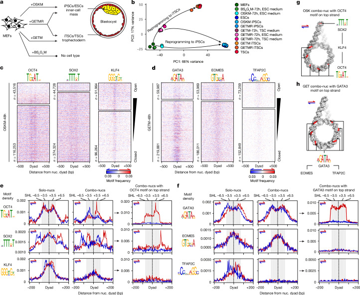 Cellular identity requires the concerted action of multiple transcription factors (TFs) bound together to enhancers of cell-type-specific genes. Despite TFs recognizing specific DNA motifs within accessible chromatin, this information is insufficient to explain how TFs select enhancers1. Here we compared four different TF combinations that induce different cell states, analysing TF genome occupancy, chromatin accessibility, nucleosome positioning and 3D genome organization at the nucleosome resolution. We show that motif recognition on mononucleosomes can decipher only the individual binding of TFs. When bound together, TFs act cooperatively or competitively to target nucleosome arrays with defined 3D organization, displaying motifs in particular patterns. In one combination, motif directionality funnels TF combinatorial binding along chromatin loops, before infiltrating laterally to adjacent enhancers. In other combinations, TFs assemble on motif-dense and highly interconnected loop junctions, and subsequently translocate to nearby lineage-specific sites. We propose a guided-search model in which motif grammar on nucleosome fibres acts as signpost elements, directing TF combinatorial binding to enhancers.
