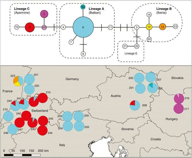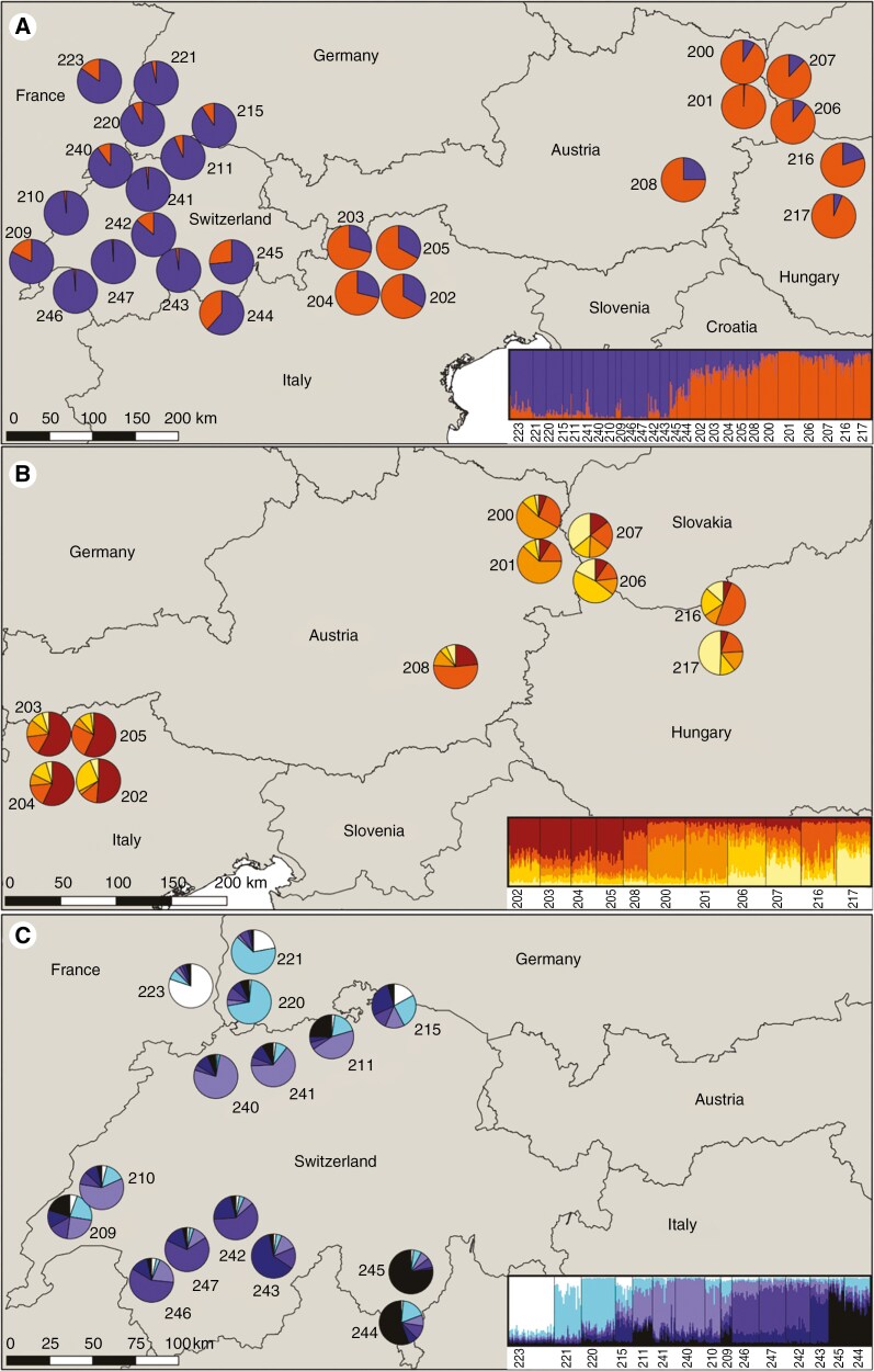 Conclusions: Our results suggest two late-glacial refugia in or near the southwestern Alps and the southeastern Alps as potential sources for post-glacial migration. Although some genetic exchange is evident in northern Italy, south of the Alps, the two clusters remain distinct at a large scale. Landscape features and introgression with Q. petraea shaped the genetic substructure at a smaller scale. Our study provides a comprehensive overview of the genetic structure of Q. pubescens in Central Europe, relevant for conservation.