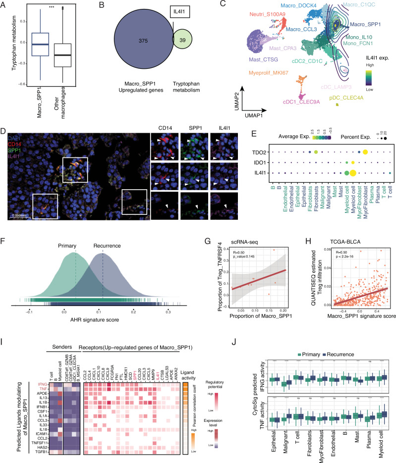 Bladder carcinoma (BLCA) is characterized by a high rate of post-surgery recurrence and multifocality. Multifocal tumors have a higher risk of recurrence compared to single tumors, significantly impacting bladder cancer-specific mortality. However, the interregional or intraregional heterogeneity within both primary and recurrent tumors remains poorly understood. Here, we employed single-cell RNA sequencing to analyze tumor lesions from five multifocal bladder cancer patients comprising three primary tumors and two recurrent tumors. Our findings revealed that malignant cells derived from recurrent multifocal bladder cancer exhibited higher interregional transcriptional similarity and consistent cellular communication. Furthermore, our analysis uncovered that malignant cells from recurrent tumors may evade immune destruction by suppressing cytokine responses and natural killer cell activity. Notably, we identified a preference for the expression of the tryptophan metabolic enzyme IL4I1 on SPP1+ macrophages in recurrent tumors. Functional analyses have revealed that IL4I1 may promotes tumor progression in recurrent tumors by activating the aryl hydrocarbon receptor (AHR) and recruiting regulatory T cells to suppress adaptive immunity. Taken together, our study provides a comprehensive understanding of primary and recurrent multifocal bladder tumors, offering valuable resources for analyzing the multifocality and recurrence of bladder cancer.