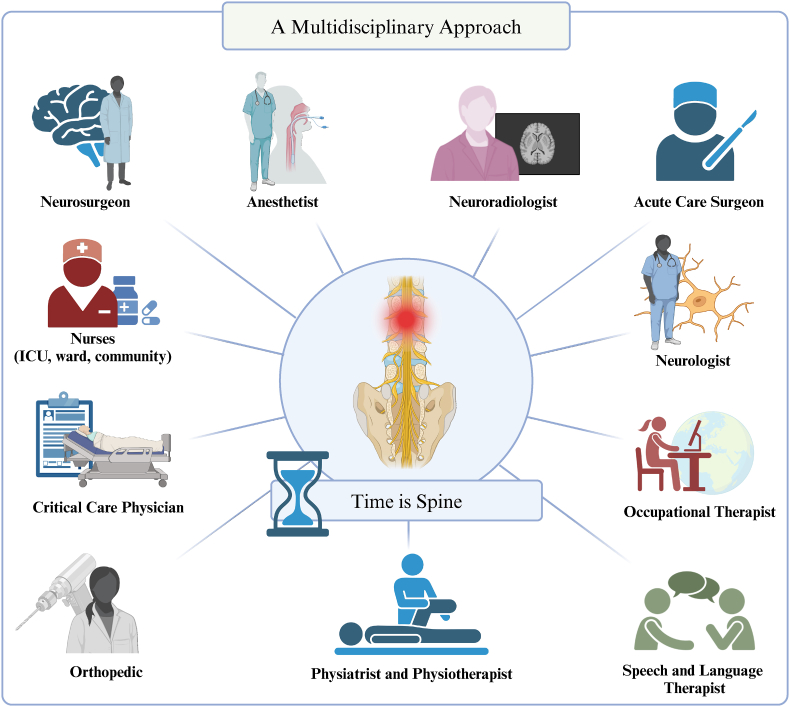 Material and methods: This narrative review focuses on: 1) extraspinal damage control surgery and resuscitation, 2) the perioperative protection of the injured spine during emergency surgery, 3) imaging and timing of spinal surgery in polytrauma, 4) early interventions for skin, bowel and bladder, and 5) the multidisciplinary approach to tSCI polytrauma patients.
