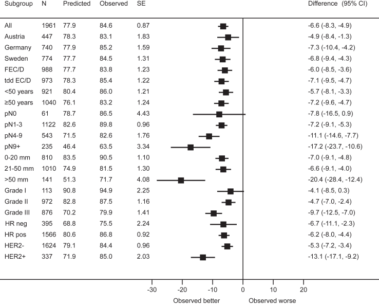 Methods: The phase 3 PANTHER trial (NCT00798070) compared adjuvant sequential epirubicin/cyclophosphamide (EC) and docetaxel (D) administered in either tailored dose-dense (tDD EC/D) or standard interval schedule (FEC/D) to patients with high-risk resected early breast cancer (n = 2003). We compared outcomes across key subgroups of interest, evaluated the performance of the online prognostication and treatment benefit estimation tool PREDICT and conducted a subpopulation treatment effect pattern plot (STEPP) analysis. Primary endpoint was breast cancer recurrence free survival (BCRFS).