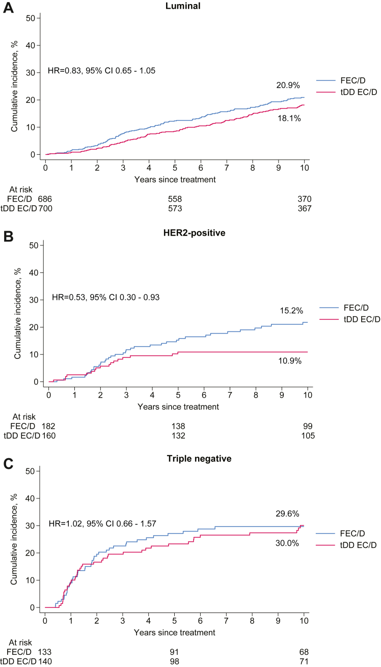 Findings: Median follow-up was 10.3 years. Treatment with tDD EC/D improved 10-year BCRFS across all subgroups including according to menopausal status, with an absolute benefit of 2% or more, as well as in luminal (Hazard Ratio [HR] = 0.83, 95% Confidence Interval [CI] 0.65-1.05) and Human Epidermal Growth Factor Receptor 2 (HER2) positive (HR = 0.53, 95% CI 0.30-0.93), but not triple negative breast cancer patients (HR = 1.02, 95% CI 0.66-1.57). PREDICT underestimated overall survival in the entire population and across all subgroups. In STEPP analysis, absolute benefit from tDD EC/D in BCRFS was stable across risk-defined subpopulations, from 3.8% in the lowest risk patients to 3.6% in the highest risk ones. There was no differential treatment effect over time.