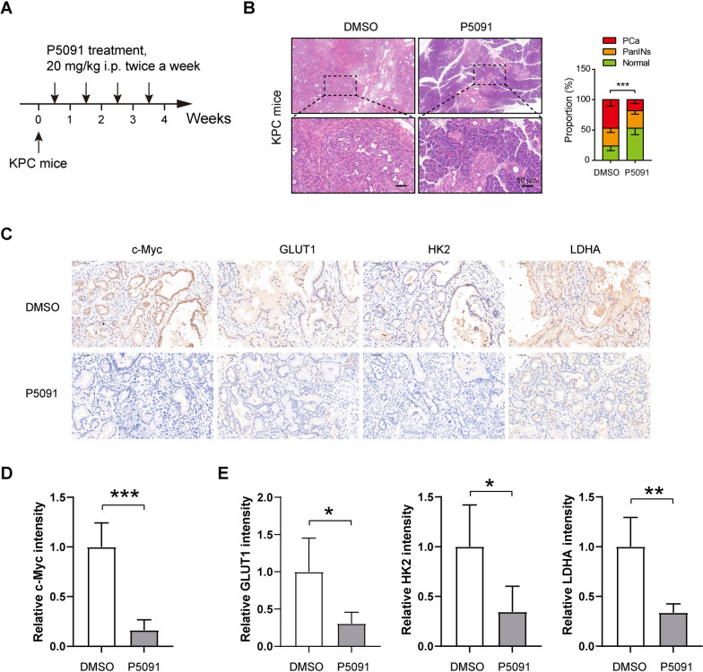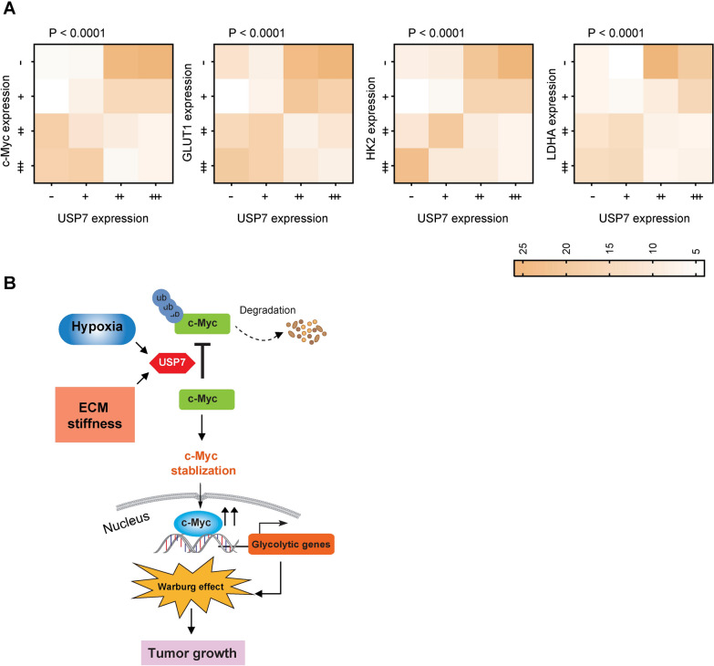 Results: USP7 is abnormally overexpressed in PDAC and predicts a poor prognosis. Hypoxia and extracellular matrix stiffness can induce USP7 expression in PDAC cells. Genetic silencing of USP7 inhibits the glycolytic phenotypes in PDAC cells, while its overexpression has the opposite effect, as demonstrated by glucose uptake, lactate production, and extracellular acidification rate. Importantly, USP7 promotes PDAC tumor growth in a glycolysis-dependent manner. The small-molecule inhibitor P5091 targeting USP7 effectively suppresses the Warburg effect and cell growth in PDAC. In a transgenic mouse model of PDAC, named KPC, P5091 effectively blocks tumor progression. Mechanistically, USP7 interacts with c-Myc, enhancing its stability and expression, which in turn upregulates expression of glycolysis-related genes.