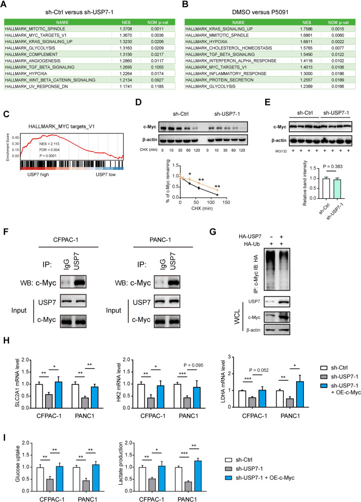 Methods: Interference and overexpression experiments were conducted to analyze the in vivo and in vitro effects of USP7 on the growth and glycolysis of tumor cells. Small-molecule inhibitors of USP7 and transgenic mouse models of PDAC were employed to assess the consequences of targeting USP7 in PDAC. The molecular mechanism underlying USP7-induced c-Myc stabilization was determined by RNA sequencing, co-IP and western blot analyses.