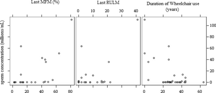 Findings: Sixty-eight patients were enrolled ( 36 SMA2 and 32 SMA3 patients). Forty-one patients had fertility data (parenthood history and spermogram analyses) and underwent 33 spermograms. Fertility disorders were identified in 27 of the 41 patients (65·9%, 95%CI 51·3-80·4%) in particular SMA2 patients: 19 cases (90.5%, CI 77·9-100%) (SMA3: 8 cases (40%, CI 18·5-61·5%). Among the patients with available spermograms, 81% (27/33) had abnormal sperm concentration; 30% presented azoospermia. These abnormalities were significantly associated with SMA type (more prevalent in SMA2 patients, p < 0·001), disease motor severity, which included age at the loss of walking ability and wheelchair use duration (p < 0·001). The Motor Function Measure (MFM) determined that the sperm counts were also correlated with disease severity (p < 0·01).