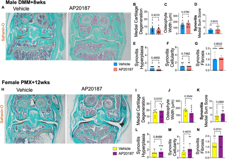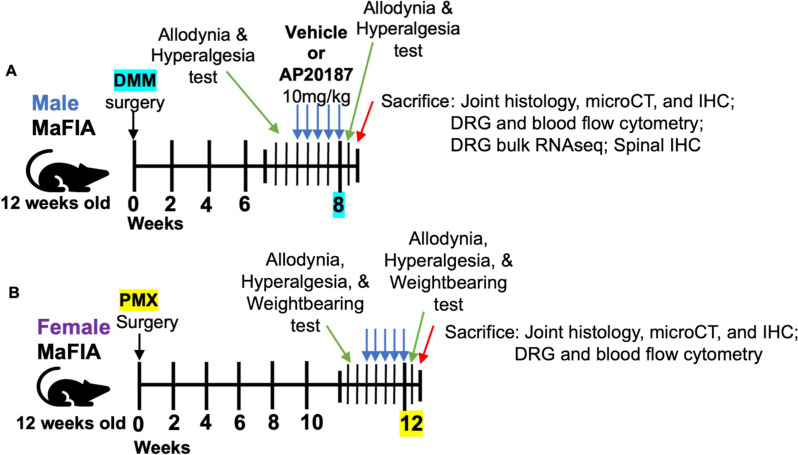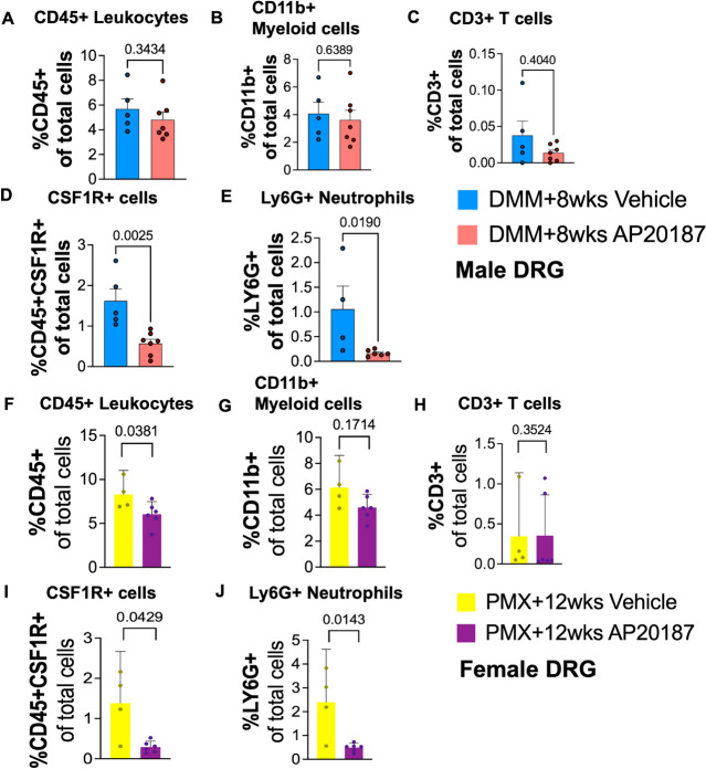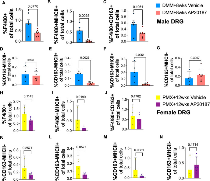 Results: Eight- and 16-weeks post DMM in male mice, AP20187-induced macrophage depletion resulted in attenuated mechanical allodynia and knee hyperalgesia. Female mice showed alleviation of mechanical allodynia, knee hyperalgesia, and weight bearing deficits after macrophage depletion at 12 weeks post PMX. Macrophage depletion did not affect the degree of cartilage degeneration, osteophyte width, or synovitis in either sex. Flow cytometry of the DRG revealed that macrophages and neutrophils were reduced after AP20187 treatment. In addition, in the DRG, only MHCII + M1-like macrophages were significantly decreased, while CD163 + MHCII- M2-like macrophages were not affected in both sexes. DRG bulk RNA-seq revealed that Cxcl10 and Il1b were upregulated with DMM surgery compared to naïve mice, and downregulated in DMM after acute macrophage depletion.
