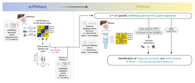 Methods: We harnessed the power of single-cell RNA sequencing in advanced HCC to derive gene expression signatures recapitulating 21 cell phenotypes. These signatures were applied to 422 RNA-sequencing samples of patients with advanced HCC treated with atezo+bev (n = 317) vs. atezolizumab (n = 47) or sorafenib (n = 58) as comparators.