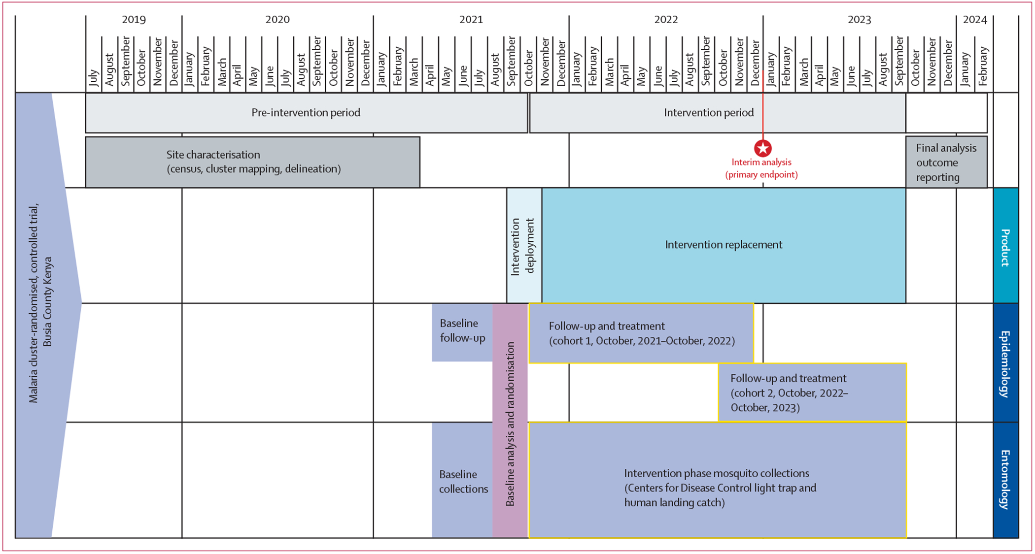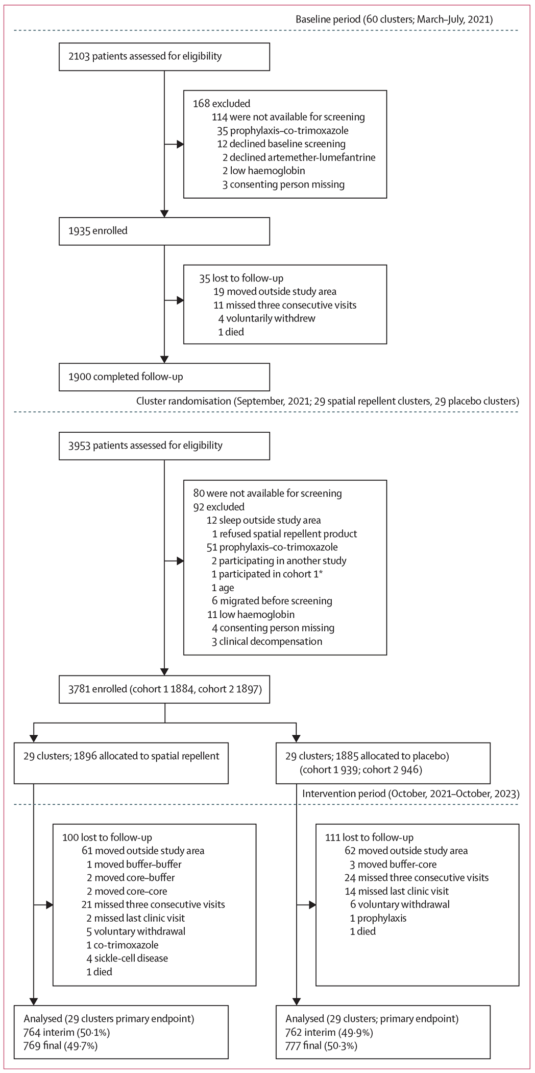 Methods: A prospective, cluster-randomised, controlled trial in Busia County, western Kenya was done to quantify the efficacy of a transfluthrin-based spatial repellent against human malaria infection following mass distribution of insecticide treated nets. Investigators, staff, and study participants were masked to cluster allocation. Infection incidence was measured by microscopy in children aged 6 months to younger than 10 years during a 4-month baseline (March-July 2021) and 24-month follow-up period with intervention (October, 2021-October, 2023). From 58 clusters (29 intervention, 29 placebo), a total of 1526 and 1546 participants from two consecutive, 12-month cohorts were assessed for first-time malaria infection (primary endpoint) by survival analysis at interim and end-of-trial timepoints, respectively. This trial is registered with ClinicalTrials.gov, NCT04766879 and is complete.
