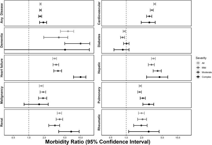Results: Diagnosis of chronic disease or risk factor was recorded for 57.6% of patients (Age adjusted rate: 52.7%, 95% Confidence Interval (CI) 51.4-54.0). The prevalence of atherosclerotic cardiovascular disease decreased, while the prevalence of heart failure and pulmonary diseases increased with increasing ACHD complexity. Compared to the general population, ACHD patients were found to have higher morbidity rates for any disease (SMR = 1.69, 95%CI: 1.64-1.74). Heart failure and atherosclerotic cardiovascular diseases were 3-times more prevalent among ACHD patients (SMR = 3.19, 95%CI: 2.92-3.46, and SMR = 3.58, 95%CI: 3.41-3.74, respectively), malignancies were 75% more prevalent. Diagnosis of any chronic disease was associated with increased mortality risk (HR = 1.77, 95%CI: 1.51-2.06), beyond the risk associated with the congenital heart disease complexity (HR = 2.37, 95% CI: 1.81-3.12).