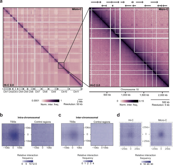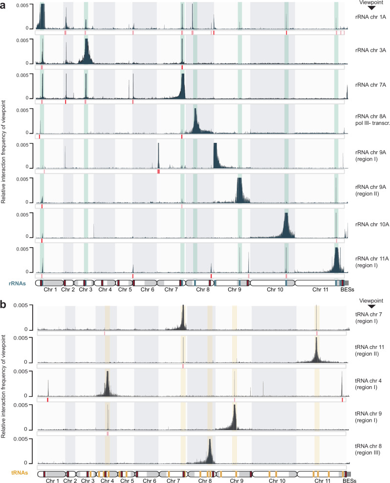 The eukaryotic nucleus exhibits a highly organized 3D genome architecture, with RNA transcription and processing confined to specific nuclear structures. While intra-chromosomal interactions, such as promoter-enhancer dynamics, are well-studied, the role of inter-chromosomal interactions remains poorly understood. Investigating these interactions in mammalian cells is challenging due to large genome sizes and the need for deep sequencing. Additionally, transcription-dependent 3D topologies in mixed cell populations further complicate analyses. To address these challenges, we used high-resolution DNA-DNA contact mapping (Micro-C) in Trypanosoma brucei, a parasite with continuous RNA polymerase II (RNAPII) transcription and polycistronic transcription units (PTUs). With approximately 300 transcription start sites (TSSs), this genome organization simplifies data interpretation. To minimize scaffolding artifacts, we also generated a highly contiguous phased genome assembly using ultra-long sequencing reads. Our Micro-C analysis revealed an intricate 3D genome organization. While the T. brucei genome displays features resembling chromosome territories, its chromosomes are arranged around polymerase-specific transcription hubs. RNAPI-transcribed genes cluster, as expected from their localization to the nucleolus. However, we also found that RNAPII TSSs form distinct inter-chromosomal transcription hubs with other RNAPII TSSs. These findings highlight the evolutionary significance of inter-chromosomal transcription hubs and provide new insights into genome organization in T. brucei.