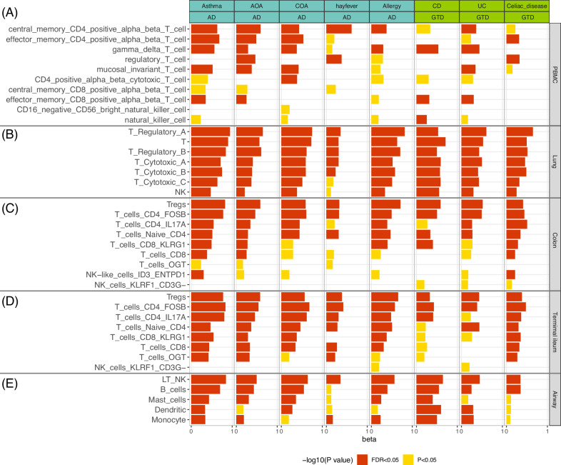 Comorbidity among atopic diseases (ADs) and gastrointestinal diseases (GIDs) has been repeatedly demonstrated by epidemiological studies, whereas the shared genetic liability remains largely unknown. Here we establish an atlas of the shared genetic architecture between 10 ADs or related traits and 11 GIDs, comprehensively investigating the comorbidity-associated genomic regions, cell types, genes and genetically predicted causality. Although distinct genetic correlations between AD-GID are observed, including 14 genome-wide and 28 regional correlations, genetic factors of Crohn's disease (CD), ulcerative colitis (UC), celiac disease and asthma subtypes are converged on CD4+ T cells consistently across relevant tissues. Fourteen genes are associated with comorbidities, with three genes are known treatment targets, showing probabilities for drug repurposing. Lower expressions of WDR18 and GPX4 in PBMC CD4+ T cells predict decreased risk of CD and asthma, which could be novel drug targets. MR unveils certain ADs led to higher risk of GIDs or vice versa. Taken together, here we show distinct genetic correlations between AD-GID pairs, but the correlated genomic loci converge on the dysregulation of CD4+ T cells. Inhibiting WDR18 and GPX4 expressions might be candidate therapeutic strategies for CD and asthma. Estimated causality indicates potential guidance for preventing comorbidity.
