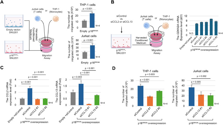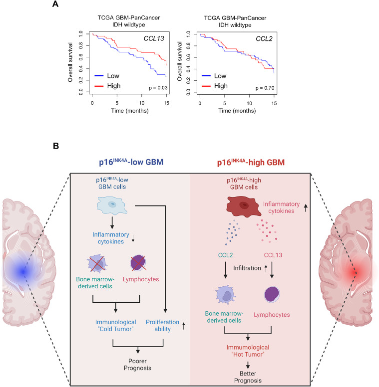 Glioblastoma, isocitrate dehydrogenase (IDH)-wildtype (GBM), is the most malignant brain tumor in adults, with limited therapeutic intervention. Previous studies have identified a few prognostic markers for GBM, including the methylation status of O6-methylguanine-DNA methyltransferase (MGMT) promoter, TERT promoter mutation, EGFR amplification, and CDKN2A/2B deletion. However, the classification of GBM remains incomplete, necessitating a comprehensive analysis. In this study, we investigated the impact of p16INK4A expression in GBM and found that p16INK4A-high GBM exhibits distinct characteristics compared to p16INK4A-low GBM. Specifically, tumor cells with p16INK4A-high expression display a senescent phenotype and are correlated with higher intra-tumoral immune cell infiltration. Furthermore, an association was observed between elevated p16INK4A expression in GBM and extended overall survival of patients. Our in vivo and in vitro studies revealed that CCL13 is predominantly expressed by p16INK4A-high GBM cells. The released CCL13 enhances the infiltration of T cells within the tumor, potentially contributing to the improved prognosis observed in patients with high p16INK4A expression. These findings suggest that tumor cells with a senescence phenotype in GBM, through the secretion of chemokines such as CCL13, may augment immune cell infiltration and potentially enhance patient outcomes by creating a more immunologically active tumor microenvironment.