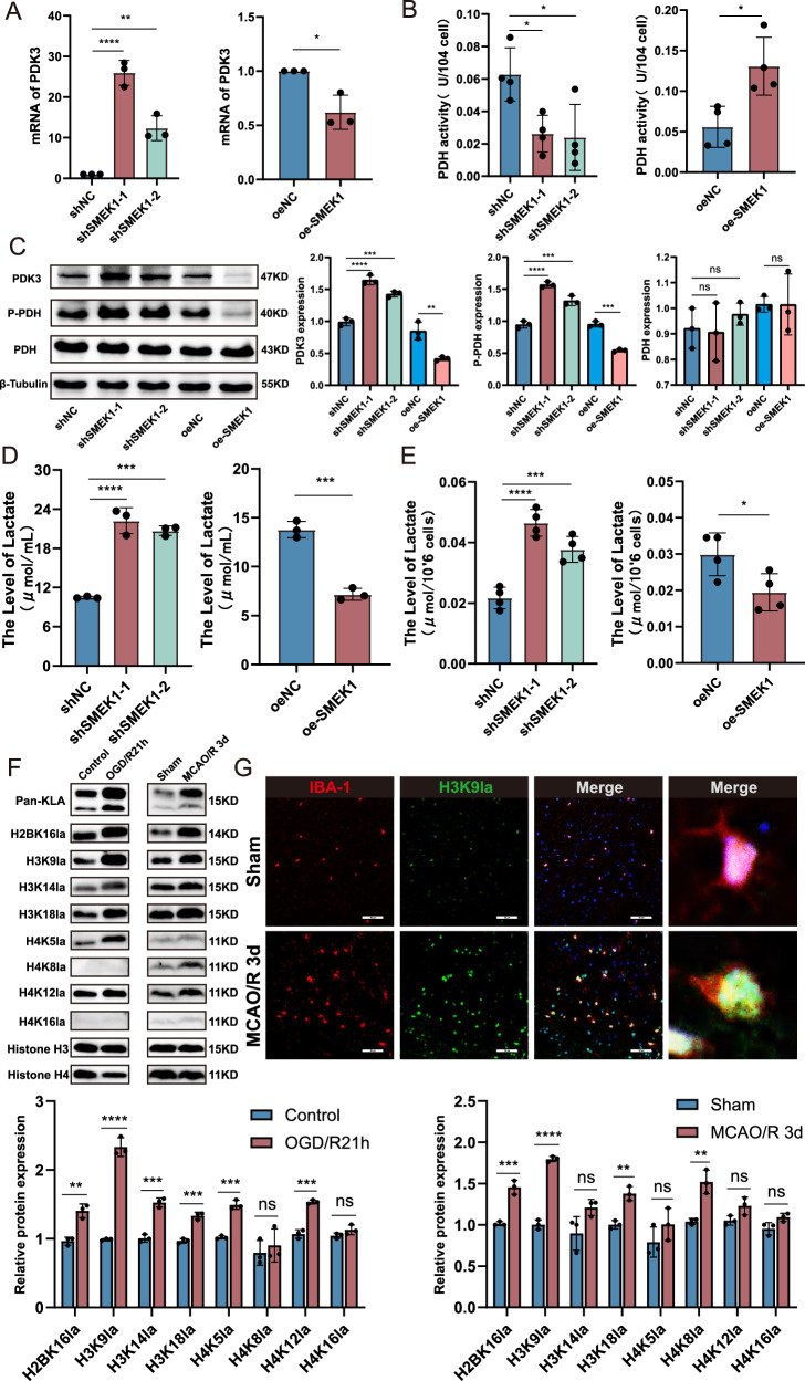 Acute ischemic stroke (AIS) triggers immune responses and neuroinflammation, contributing to brain injury. Histone lactylation, a metabolic stress-related histone modification, plays a critical role in various diseases, but its involvement in cerebral ischemia remains unclear. This study utilized a transient middle cerebral artery occlusion/reperfusion (MCAO/R) model and an oxygen-glucose deprivation/reoxygenation (OGD/R) model to investigate the role of microglial histone lactylation in ischemia-reperfusion injury. Lactate overload post-AIS increased histone lactylation, while reduced SMEK1 expression in microglia correlated with elevated lactate and neuroinflammation. Microglia-specific SMEK1 deficiency enhanced lactate production by inhibiting the pyruvate dehydrogenase kinase 3-pyruvate dehydrogenase (PDK3-PDH) pathway, increasing H3 lysine 9 lactylation (H3K9la), activating Ldha and Hif-1α transcription, and promoting glycolysis. SMEK1 overexpression improved neurological recovery in ischemic mice. This study highlights SMEK1 as a novel regulator of histone lactylation and a potential therapeutic target for mitigating neuroinflammation and enhancing recovery after AIS.