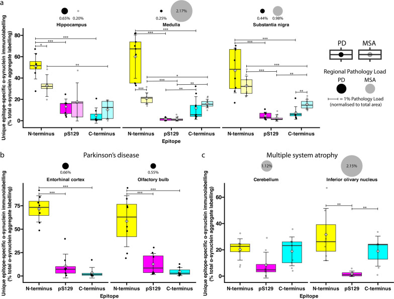 Methods: We utilised a multiplex immunohistochemical approach to detect multiple structural domains of α-Syn proteoforms across multiple regions prone to pathological accumulation in MSA (n = 10) and PD (n = 10). Comparison of epitope-specific α-Syn proteoforms was performed in the MSA medulla, inferior olivary nucleus, substantia nigra, hippocampus, and cerebellum, and in the PD olfactory bulb, medulla, substantia nigra, hippocampus, and entorhinal cortex.