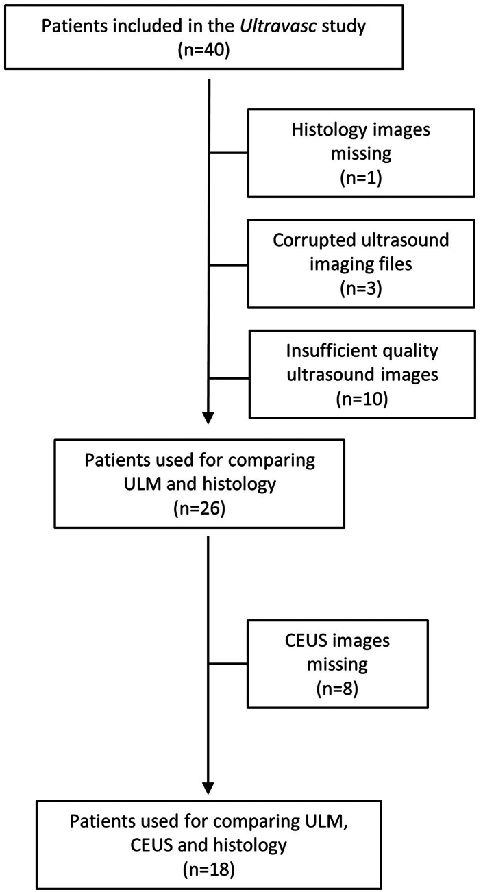 Methods: We conducted a prospective, monocentric, study involving patients who were undergoing carotid endarterectomy (CEA) for carotid artery stenosis. The day before CEA ultrasound examination coupled with the injection of microbubbles (MB) as a contrast agent (CEUS) to image the MB circulating within and around the carotid plaque was performed. CEUS images analysis classified patients into 2 groups: absence of neovascularisation (group A) or presence of neovascularisation (group B). ULM was performed by localising and tracking individual MB centres to reconstruct the neovessels structure with a resolution of around 60 μm. Plaques were manually segmented on the images to quantify the number of neovessels and various haemodynamic metrics inside the plaques. Histological analysis of the excised carotid plaque specimens classified patients into 2 groups: absence of neovascularisation (group I) or presence of neovascularisation (group II).