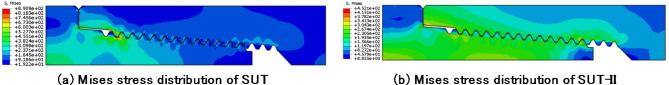 The design of drill pipe joint thread with unequal taper is proposed to investigate the fracture failure of the API NC38 used in the drill pipe joint of the SU36-8-4H2 well. The effect of changes in thread taper on the stress distribution and mechanical properties of drill pipe joints is analyzed and compared with the API standard thread to determine the optimal thread structure with unequal taper. The results reveal highly concentrated stress at the last engaged thread root of API NC38 single-shoulder thread (SUT) may cause early yield failure of the joint threads. Adjusting the unequal taper of the pin thread mitigates uneven stress distribution in NC38 single and double-shoulder threads and enhances connection strength, particularly for SUT-II and DUT-I. However, altering the box thread's unequal taper modifies the stress concentration slightly in NC38 single and double-shoulder threads. This offers limited tensile and compressive strength improvement. The maximum Mises stress value of SUT-II is reduced by 56.69% compared to SUT. The maximum Mises stress value of DUT-I is reduced by 34.87% compared to NC38 double-shoulder joint thread (DUT). This design approach can guide the optimization of other API threads and enhance joint strength for non-API and specialized taper threads.