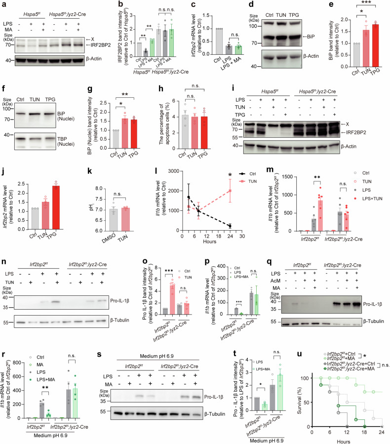 Metabolites can double as a signaling modality that initiates physiological adaptations. Metabolism, a chemical language encoding biological information, has been recognized as a powerful principle directing inflammatory responses. Cytosolic pH is a regulator of inflammatory response in macrophages. Here, we found that L-malate exerts anti-inflammatory effect via BiP-IRF2BP2 signaling, which is a sensor of cytosolic pH in macrophages. First, L-malate, a TCA intermediate upregulated in pro-inflammatory macrophages, was identified as a potent anti-inflammatory metabolite through initial screening. Subsequent screening with DARTS and MS led to the isolation of L-malate-BiP binding. Further screening through protein‒protein interaction microarrays identified a L-malate-restrained coupling of BiP with IRF2BP2, a known anti-inflammatory protein. Interestingly, pH reduction, which promotes carboxyl protonation of L-malate, facilitates L-malate and carboxylate analogues such as succinate to bind BiP, and disrupt BiP-IRF2BP2 interaction in a carboxyl-dependent manner. Both L-malate and acidification inhibit BiP-IRF2BP2 interaction, and protect IRF2BP2 from BiP-driven degradation in macrophages. Furthermore, both in vitro and in vivo, BiP-IRF2BP2 signal is required for effects of both L-malate and pH on inflammatory responses. These findings reveal a previously unrecognized, proton/carboxylate dual sensing pathway wherein pH and L-malate regulate inflammatory responses, indicating the role of certain carboxylate metabolites as adaptors in the proton biosensing by interactions between macromolecules.