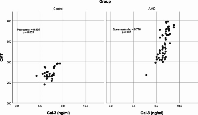 To investigate the effect of serum galectin-3 on naive neovascular AMD and its use as a serum marker by revealing the variation in this molecule between patient and control groups. Fifty-six naive neovascular AMD patients and 30 healthy control age-matched healthy subjects were included in this prospective case‒control study. Blood samples were obtained and used for analysis of complete blood count; High sensitivity C-reactive protein (HsCRP), erythrocyte sedimentation rate (ESR), low-density lipoprotein (LDL), high-density lipoprotein (HDL), triglyceride (TG), total cholesterol, homocysteine, HbA1c and galectin-3 levels. The average HsCRP level in the AMD group was significantly higher than that in the control group (p < 0.001). The median leukocyte count was significantly higher in the AMD group than in the control group (p < 0.001). Total cholesterol, LDL and TG levels were significantly higher in the AMD group than in the control group (p < 0.001; in all comparisons). The mean HDL level was significantly lower in the AMD group than in the control group (p < 0.001). The mean galectin-3 level was 8.79 ± 0.55 in the AMD group and 6.55 ± 0.55 in the control group. There was a statistically significant increase in galectin-3 levels in the AMD group (p < 0.001). There was a significant positive correlation between CMT and galectin-3 levels in the control (r = 0.495, p = 0.005) and AMD (r = 0.776, p < 0.001) groups. This study reports that serum Gal-3 concentration was higher in the AMD group compared to the control group and positively correlated with CMT.