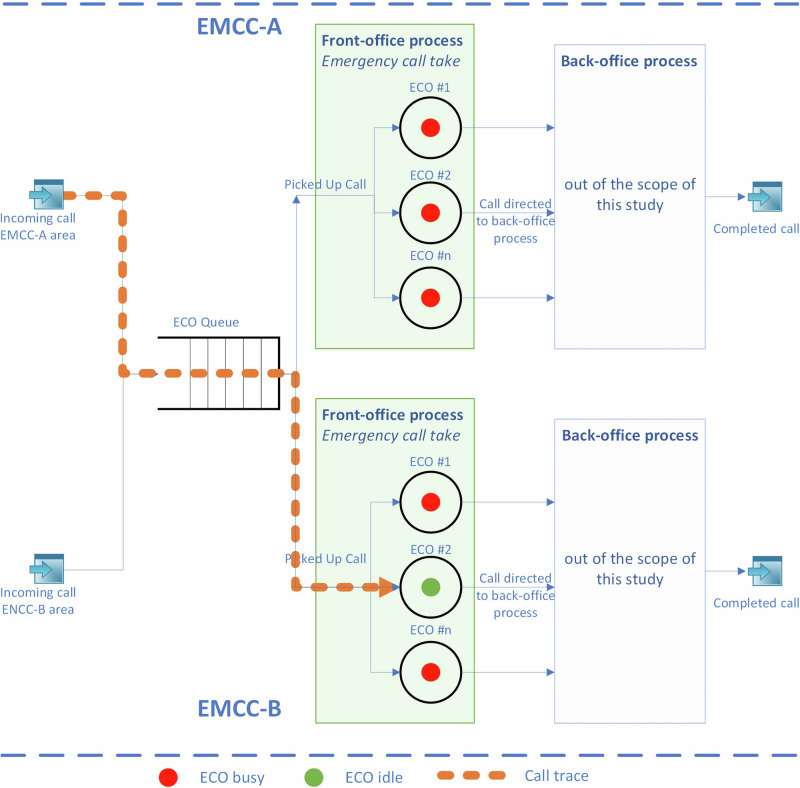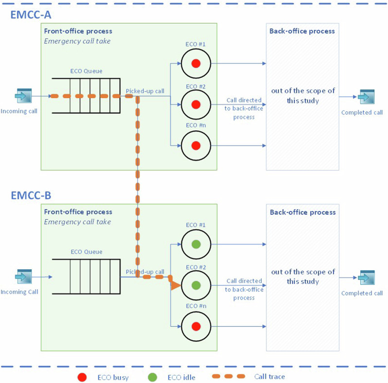 In emergency situations, timely contact with emergency medical communication centers (EMCCs) is critical for patient outcomes. Increasing call volumes and economic constraints are challenging many countries, necessitating organizational changes in EMCCs. This study uses a simulation-based digital twin approach, creating a virtual model of EMCC operations to assess the impact of different organizational scenarios on accessibility. Specifically, we explore two decompartmentalized scenarios where traditionally isolated call centers are reorganized to enable more flexible call distribution. The primary measure of accessibility was service quality within 30 s of call reception. Our results show that decompartmentalization improves service quality by 17% to 21%. This study demonstrates that reducing regional isolation in EMCCs can enhance performance and accessibility with a simulation-based digital twin approach providing a clear and objective method to quantify the benefits."