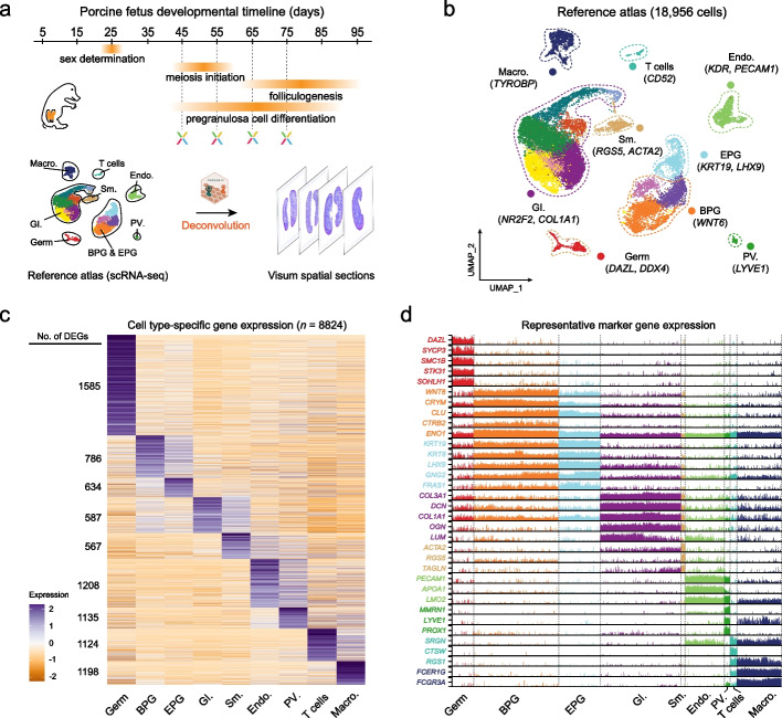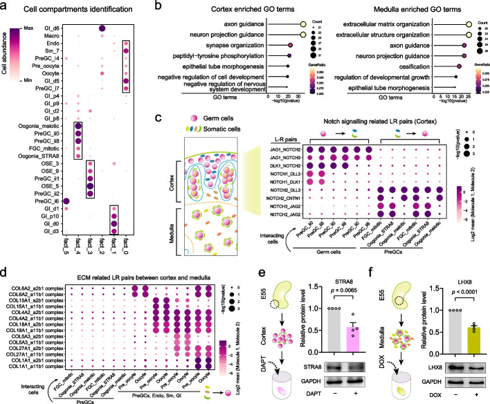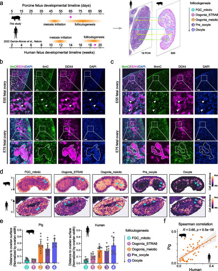 Results: Here, we integrate single-cell RNA sequencing (scRNA-seq) and spatial transcriptomics (ST) to comprehend spatial-temporal gene expression profiles and explore the spatial organization of ovarian microenvironments during early oogenesis in pigs. Projection of the germ cell clusters at different stages of oogenesis into the spatial atlas unveils a "cortical to medullary (C-M)" distribution of germ cells in the developing porcine ovaries. Cross-species analysis between pigs and humans unveils a conserved C-M distribution pattern of germ cells during oogenesis, highlighting the utility of pigs as valuable models for studying human oogenesis in a spatial context. RNA velocity analysis with ST identifies the molecular characteristics and spatial dynamics of granulosa cell lineages originating from the cortical and medullary regions in pig ovaries. Spatial co-occurrence analysis and intercellular communication analysis unveils a distinct cell-cell communication pattern between germ cells and somatic cells in the cortex and medulla regions. Notably, in vitro culture of ovarian tissues verifies that intercellular NOTCH signaling and extracellular matrix (ECM) proteins played crucial roles in initiating meiotic and oogenic programs, highlighting an underappreciated role of ovarian microenvironments in orchestrating germ cell fates.