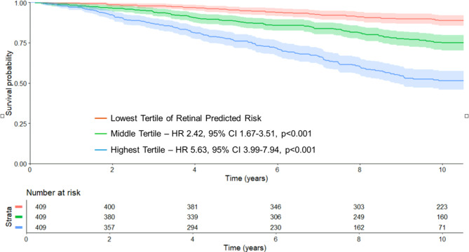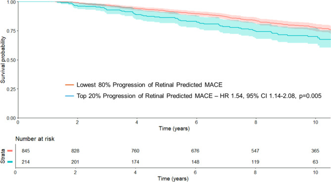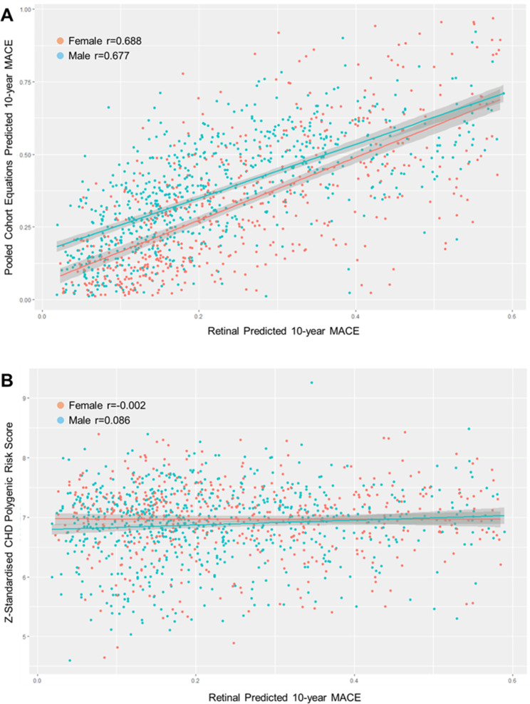 Results: 1241 individuals were included in the test cohort (mean PCE 10-year CVD risk 35%). There was a strong correlation between retinal predicted CVD risk and the PCE risk score (r = 0.66) but not the polygenic risk score (r = 0.05). There were 288 MACE events. Higher retina-predicted risk was significantly associated with increased 10-year risk of MACE (HR 1.05 per 1% increase; 95% CI 1.04-1.06, p < 0.001) and remained so after adjustment for the PCE and polygenic risk score (HR 1.03; 95% CI 1.02-1.04, p < 0.001). The retinal risk score had similar performance to the PCE (both AUC 0.697) and when combined with the PCE and polygenic risk score had significantly improved performance compared to the PCE alone (AUC 0.728). An increase in retinal-predicted risk within 3 years was associated with subsequent increased MACE likelihood.