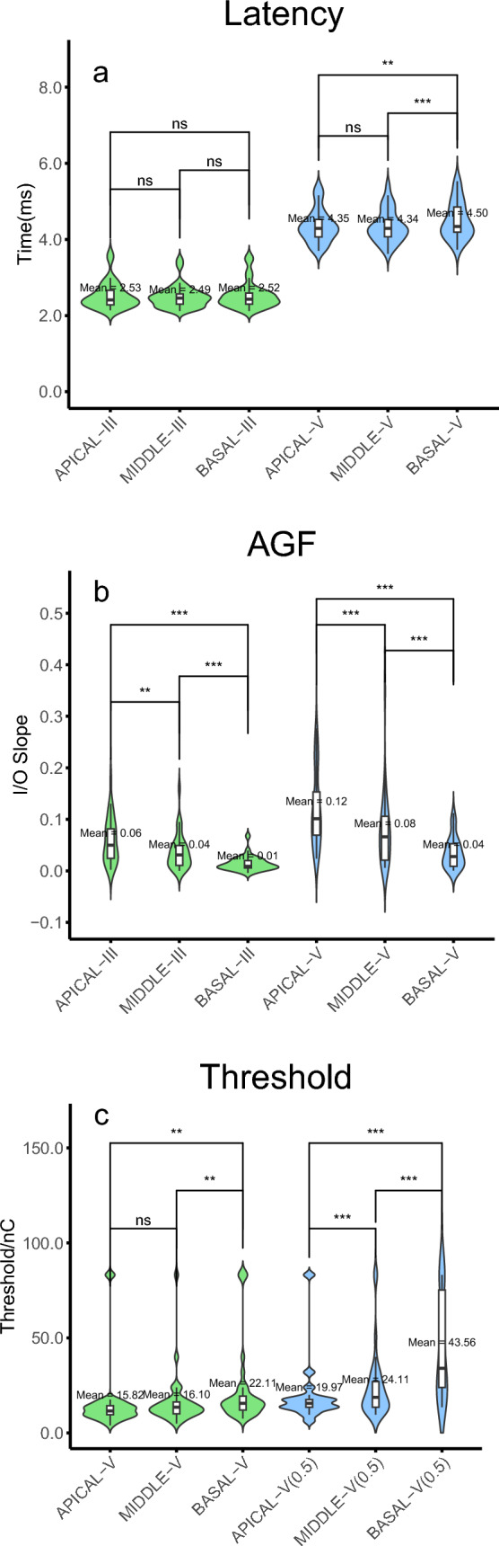 Results: A significantly shorter eV latency, lower eV threshold, lower eV threshold0.5 μV and steeper I/O slopes for both eV and eIII were observed when these responses were evoked at the apical electrode, compared to the middle and basal positions. Implantation age was significantly negatively correlated with bisyllables recognition rate (R2 = 0.20, p = 0.0194). The eIII slope at the apical site and the eV slope at the basal site demonstrated the highest R2 values in positive correlation with CAP, both with R2 = 0.09. Among the EABR parameters, the regression models based on MSP bisyllables recognition rate, basal eV latency, eV thresholds and threshold0.5 μV recorded at the apical and middle positions were statistically significant.