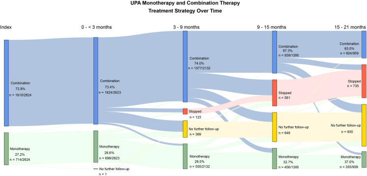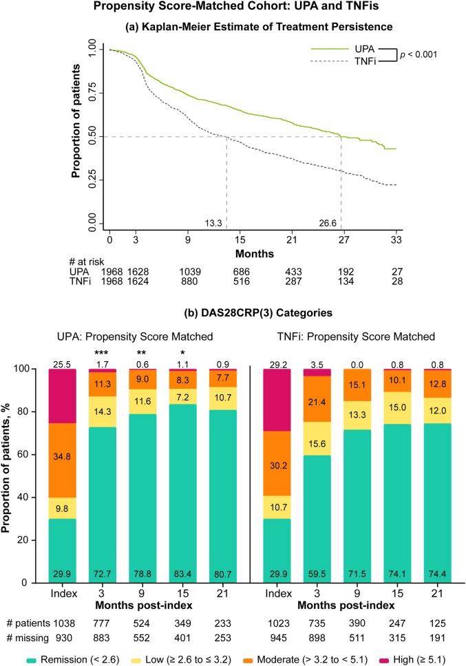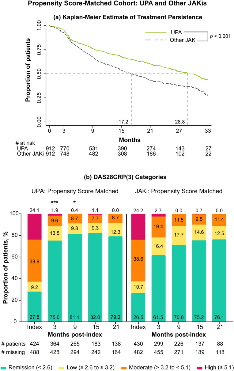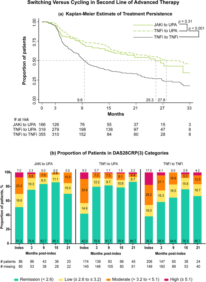 Results: In patients prescribed UPA, 41.3% were ≥ 65 years old, 33.8% were prescribed as first-line advanced therapy, and 27.2% were prescribed monotherapy. Persistence on UPA was 26.6 months (95% confidence intervals: 24.4, 29.9) and longest in earlier lines of therapy. The DAS28CRP(3) remission rate was 73% at 3 months, with improvements observed across lines of therapy. UPA monotherapy and combination therapy had similar persistence (27.8 [23.5, 33.4] versus 30.4 months [22.1, 35.3], p = 0.84) and effectiveness. UPA showed longer persistence than other JAKis (28.8 [25.6, 32.4] versus 17.2 months [14.9, 19.8], p < 0.001) and TNFis (26.6 [24.9, 30.8] versus 13.3 months [11.5, 14.5], p < 0.001). DAS28CRP(3) remission rates were greater at 3 months for UPA than other JAKis (75.0% versus 61.5%) and TNFis (72.7% versus 59.5%). In unmatched subgroups, compared to cycling between TNFis, switching to UPA from other JAKis or TNFis resulted in longer persistence (JAKi-to-UPA: 25.3 [16.1, not reached]; TNFi-to-UPA: 27.8 [23.2, 35.4]; TNFi-to-TNFi: 9.6 [8.4, 10.7]) and greater DAS28CRP(3) remission rates over 9 months.