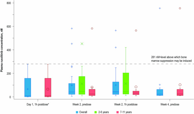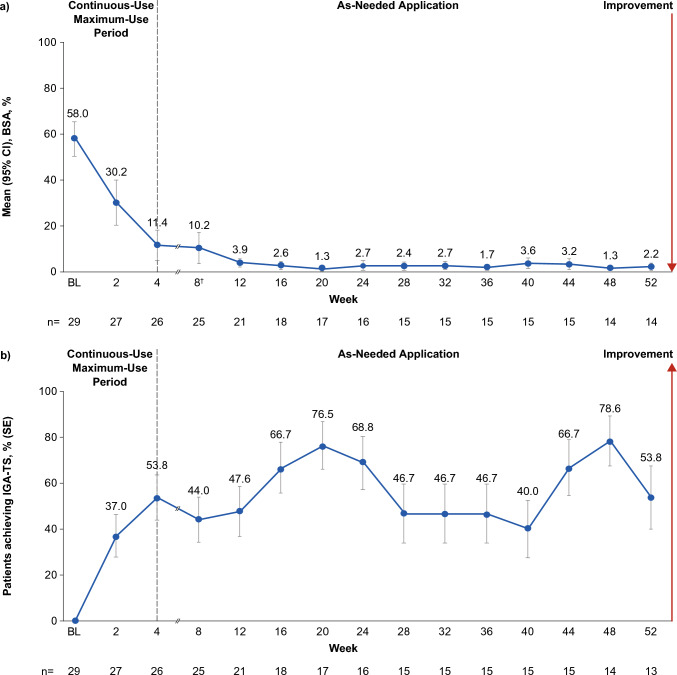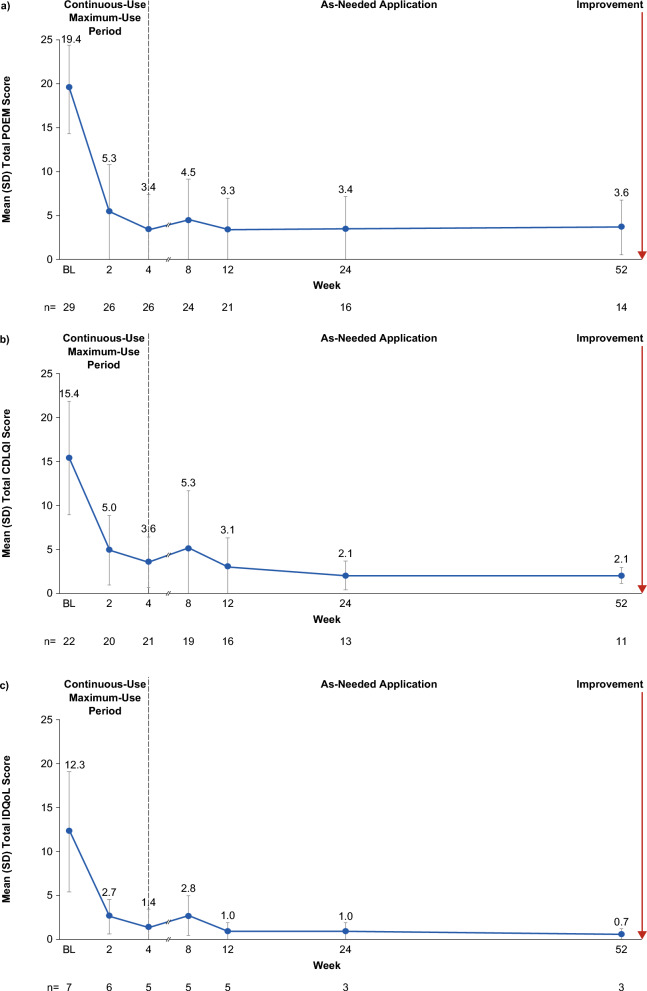 Results: Overall, 29 patients (median age 5 years) were enrolled. Treatment-emergent adverse events were reported in 9/29 patients (31.0%); there were no adverse events of special interest (i.e., no serious infections, malignancies, major adverse cardiovascular events, or thromboses) during the study period. Mean steady-state plasma concentration during the maximum-use period was below the known half-maximal inhibitory concentration of Janus kinase-mediated myelosuppression in adults. Reductions in affected BSA and IGA observed at week 4 were sustained with as-needed use through 52 weeks. Improvements in patient-reported outcomes and QoL measures were consistent with efficacy results.