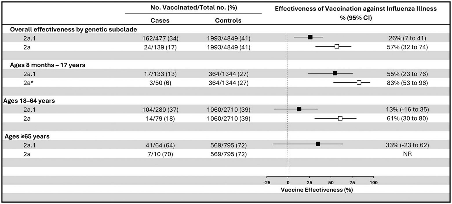 Conclusions: Vaccination reduced outpatient medically attended influenza overall by 41% and provided protection overall against circulating influenza A and B viruses. Serologic studies would help inform differences observed by age groups.