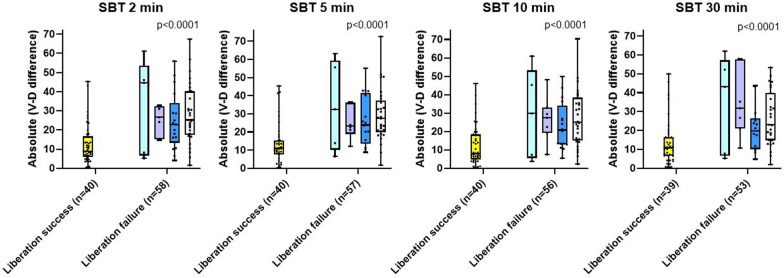 Results: Among a total of 98 patients analyzed, 85 passed SBT (87%), but rapid liberation success occurred only in 40; 13.5% of extubated patients required reintubation. From the first minutes to the entire SBT duration, the absolute ventral-to-dorsal difference was consistently smaller in liberation success compared to all subgroups of failure (p < 0.0001). An absolute difference at 5 min of SBT > 20% was associated with failure of liberation, with sensitivity and specificity of 71% and 78% and positive predictive value 81% in a validation cohort.
