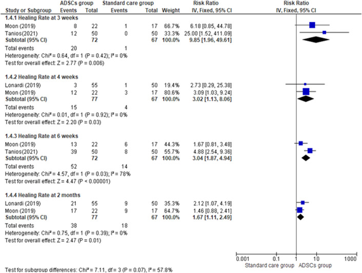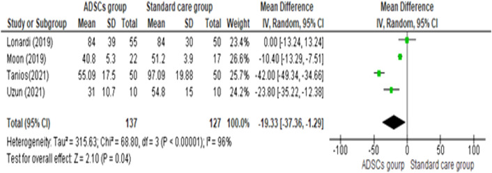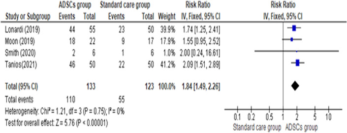 Results: Regarding the total healing state, five studies reported that more participants healed completely at the end of the follow-up period in the ADSCs group (Risk ratio = 1.56, 95% CI [1.32, 1.86], P < 0.00001), for the healing rate the overall effect estimate favors the ADSCs group (pooled effect estimate = 1.84, 95% CI [1.51, 2.89], P < 0.00001), and regarding the healing time the pooled mean difference of the studies demonstrated that the ADSCs group required fewer days to heal than the standard care group. (pooled mean difference = -19.33, 95% CI [-37.36, -1.29], P = 0.04).