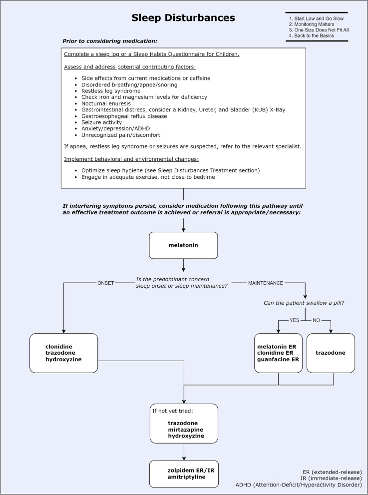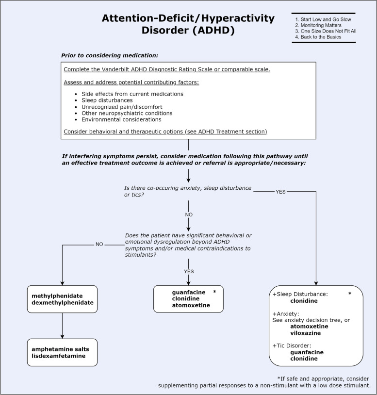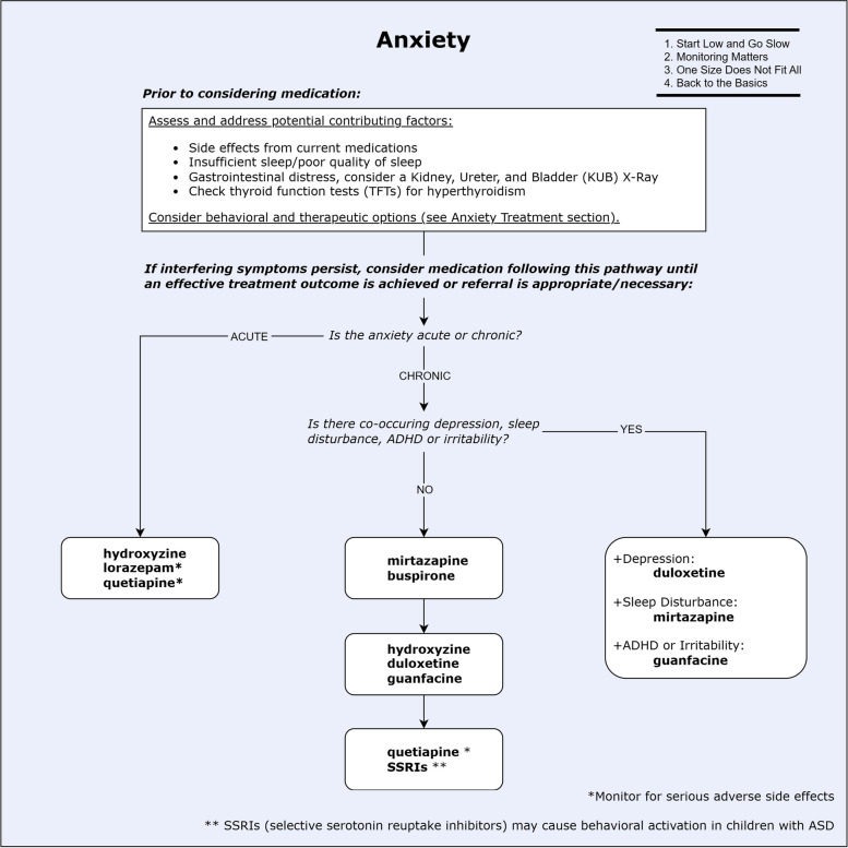 Results: The pharmacological treatment pathways reflect how appropriate medication options for ASD patients can depend on many factors unique to the patient and can differ from established non-autistic SOC. Key takeaways include: For sleep disturbances in ASD, initial strategies align with non-autistic SOC, emphasizing sleep hygiene and melatonin use. First-line recommendations for treating ADHD, anxiety, and depression in ASD differ from non-autistic SOC; α2-adrenergic agonists are more suitable than stimulants for some ASD-ADHD patients, buspirone and mirtazapine are preferred to selective serotonin reuptake inhibitors (SSRIs) for anxiety, and duloxetine, mirtazapine, bupropion, and vortioxetine are recommended ahead of SSRIs for depression. Addressing irritability in ASD requires interdisciplinary evaluation of contributing factors, and guanfacine, risperidone, or aripiprazole may be appropriate, depending on severity.