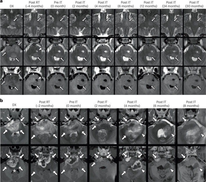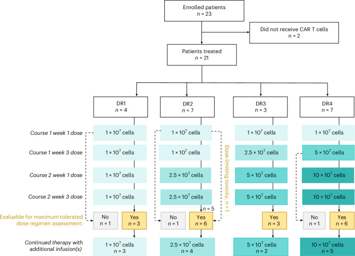 Diffuse intrinsic pontine glioma (DIPG) is a fatal central nervous system (CNS) tumor that confers a median survival of 11 months. As B7-H3 is expressed on pediatric CNS tumors, we conducted BrainChild-03, a single-center, dose-escalation phase 1 clinical trial of repetitive intracerebroventricular (ICV) dosing of B7-H3-targeting chimeric antigen receptor T cells (B7-H3 CAR T cells) for children with recurrent or refractory CNS tumors and DIPG. Here we report results from Arm C, restricted to patients with DIPG. The primary objectives were to assess feasibility and tolerability, which were both met. Secondary objectives included assessments of CAR T cell distribution and survival. A total of 23 patients with DIPG enrolled, and 21 were treated with repeated doses of ICV B7-H3 CAR T cells using intra-patient dose-escalation regimens without previous lymphodepletion. Concurrent tumor-directed therapy, including re-irradiation, was not allowed while on protocol therapy. We delivered a total of 253 ICV doses and established the highest planned dose regimen, DR4, which escalated up to 10 × 107 cells per dose, as the maximally tolerated dose regimen. Common adverse events included headache, fatigue and fever. There was one dose-limiting toxicity (intratumoral hemorrhage) during DR2. For all treated patients (n = 21), the median survival from their initial CAR T cell infusion was 10.7 months and the median survival from diagnosis was 19.8 months with 3 patients still alive at 44, 45 and 52 months from diagnosis. Ultimately, this completed first-in-human trial shows that repetitive ICV dosing of B7-H3 CAR T cells in pediatric and young adult patients with DIPG is tolerable, including multiyear repeated dosing, and may have clinical efficacy that warrants further investigation on a multisite phase 2 trial. ClinicalTrials.gov registration: NCT04185038 .