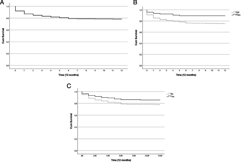 Results: Overall, 90.5% (n = 398) of the patients were treated surgically, 57.0% (n = 227) retained the implant, and 88.7% (n = 353) managed with fixation. Mortality rates were 8.2% (n = 3.6) in-hospital, 11.4% (n = 50) at 30 days, 21.1% (n = 93) at six months, and 21.6% (n = 95) at 12 months. Medical complications, mainly delirium, were common in the acute setting (52.7%, n = 215). The nonunion rate was 4.1% (n = 18). Mortality risk factors in the univariate analysis were age, living at a nursing home, no walking outdoors, frailty variables, fractures in the distal epiphysis, fractures around a proximal nail, discharge to a healthcare facility, and no osteoporotic treatment at discharge. Protective factors against mortality in the univariate analysis were surgical treatment by an experienced surgeon, management without an arthroplasty, allowing full weightbearing, mobilization in the first 48 hours postoperatively, and geriatric involvement. Risk factors for mortality in the multivariate analysis were cognitive impairment (Pfeiffer's questionnaire) (hazard ratio (HR) 1.14 (95% CI 1.05 to 1.23), p = 0.002), age-adjusted CCI (HR 1.18 (95% CI 1.07 to 1.30), p = 0.001), and antiaggregant or anticoagulant medication at admission (HR 2.00 (95% CI 1.19 to 3.38), p = 0.009). Haemoglobin level at admission was protective against mortality (HR 0.85 (95% CI 0.74 to 0.97), p = 0.018).