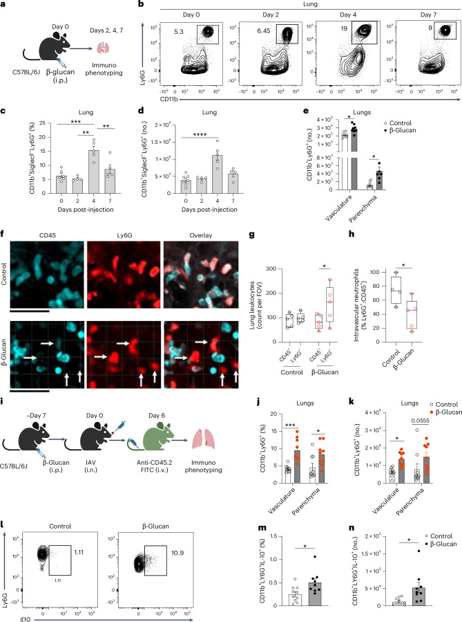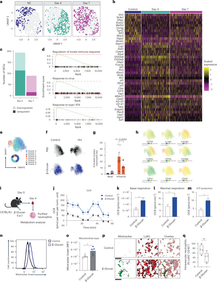 Disease tolerance is an evolutionarily conserved host defense strategy that preserves tissue integrity and physiology without affecting pathogen load. Unlike host resistance, the mechanisms underlying disease tolerance remain poorly understood. In the present study, we investigated whether an adjuvant (β-glucan) can reprogram innate immunity to provide protection against influenza A virus (IAV) infection. β-Glucan treatment reduces the morbidity and mortality against IAV infection, independent of host resistance. The enhanced survival is the result of increased recruitment of neutrophils via RoRγt+ T cells in the lung tissue. β-Glucan treatment promotes granulopoiesis in a type 1 interferon-dependent manner that leads to the generation of a unique subset of immature neutrophils utilizing a mitochondrial oxidative metabolism and producing interleukin-10. Collectively, our data indicate that β-glucan reprograms hematopoietic stem cells to generate neutrophils with a new 'regulatory' function, which is required for promoting disease tolerance and maintaining lung tissue integrity against viral infection.