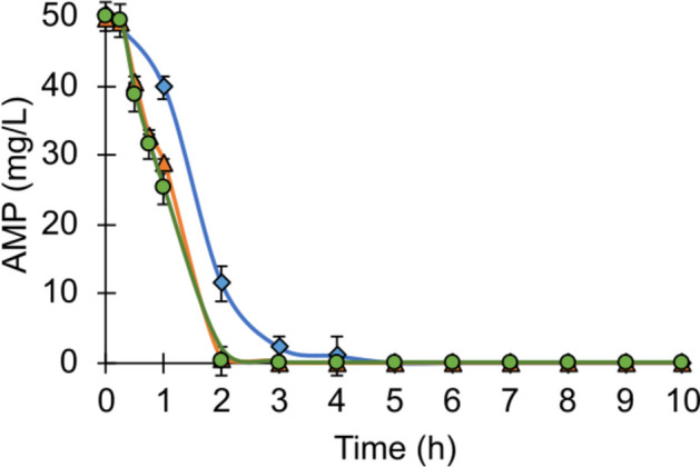 The presence of antibiotics in wastewater discharges significantly affects the environment, mainly due to the generation of bacterial populations with multiple antibiotic resistances. The cometabolic capacity of nitrifying sludge to simultaneously remove ammonium (NH4+) and emerging organic contaminants (EOCs), including antibiotics, has been reported. In the present study, the removal capacity of 50 mg ampicillin (AMP)/L by nitrifying cultures associated with biosorption and biotransformation processes was evaluated in a sequencing batch reactor (SBR) system. The contribution of nitrifying enzymes (ammonium monooxygenase (AMO) and nitrite oxidoreductase (NOR)) and β-lactamases in AMP biodegradation was evaluated using specific inhibitors in batch cultures. AMP was 100% eliminated after 5 h since the first cycle of operation. The sludge maintained its ammonium oxidizing capacity with the total consumption of 102.0 ± 2.5 mg NH4+-N/L in 9 h, however, the addition of AMP altered the nitrite-oxidizing process of nitrification, recovering 30 cycles later at both physiological and kinetic level. The kinetic activity of the nitrifying sludge improved along the operating cycles for both AMP removal and nitrification processes. The elimination of 24% AMP was attributed to the biosorption process and 76% to biotransformation, wherein the AMO enzyme contributed 95% to its biodegradation. Finally, the repeated exposure of the sludge to AMP for 72 operating cycles (36 days) was not sufficient to detect β-lactamase activity. The cometabolic ability of ammonium-oxidizing bacteria for biodegrading AMP could be employed for bioremediation of wastewater.