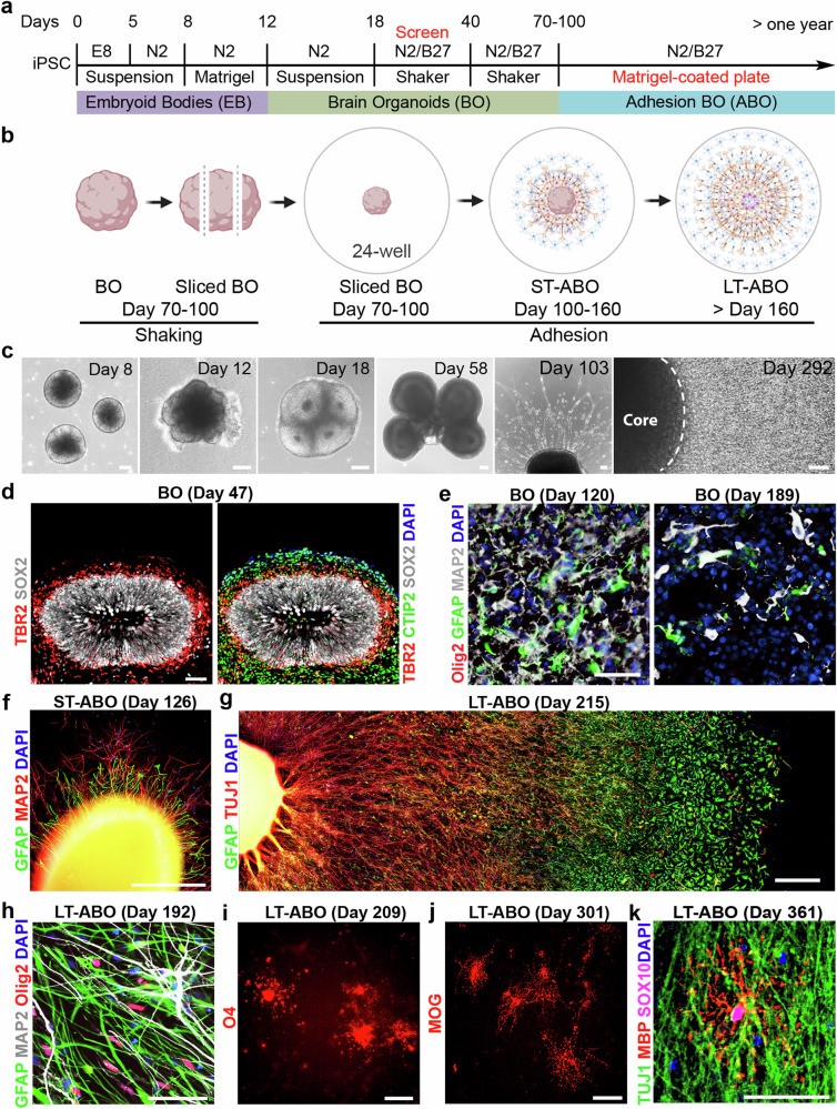 Brain organoid models have greatly facilitated our understanding of human brain development and disease. However, key brain cell types, such as microglia, are lacking in most brain organoid models. Because microglia have been shown to play important roles in brain development and pathologies, attempts have been made to add microglia to brain organoids through co-culture. However, only short-term microglia-organoid co-cultures can be established, and it remains challenging to have long-lasting survival of microglia in organoids to mimic long-term residency of microglia in the brain. In this study, we developed an adhesion brain organoid (ABO) platform that allows prolonged culture of brain organoids (greater than a year). Moreover, the long-term (LT)-ABO system contains abundant astrocytes and can support prolonged survival and ramification of microglia. Furthermore, we showed that microglia in the LT-ABO could protect neurons from neurodegeneration by increasing synaptic density and reducing p-Tau level and cell death in the LT-ABO. Therefore, the microglia-containing LT-ABO platform generated in this study provides a promising human cellular model for studying neuron-glia and glia-glia interactions in brain development and the pathogenesis of neurodegenerative diseases such as Alzheimer's disease.
