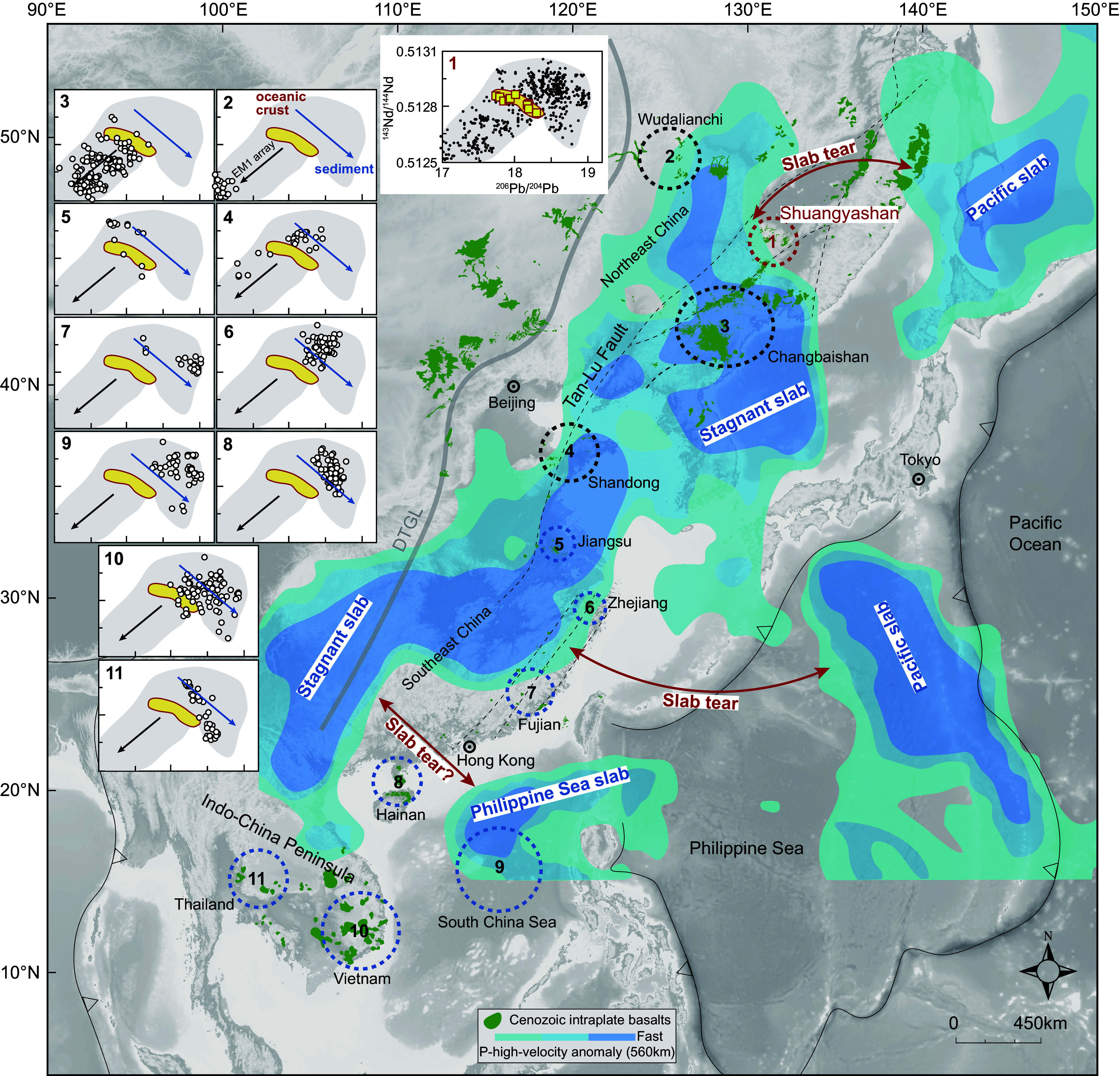 Keywords: intraplate basalts; mantle transition zone; mantle upwelling; slab tear; stagnant slab.