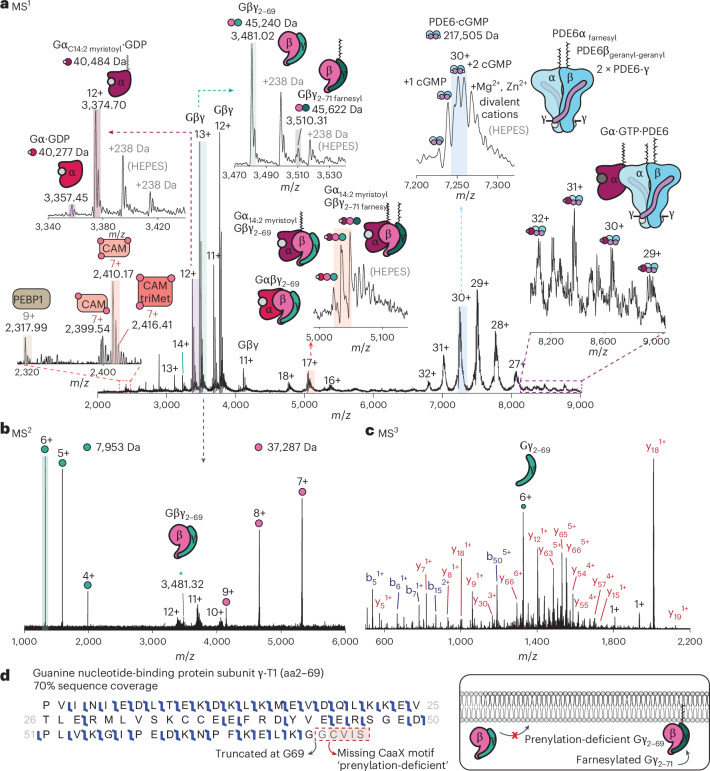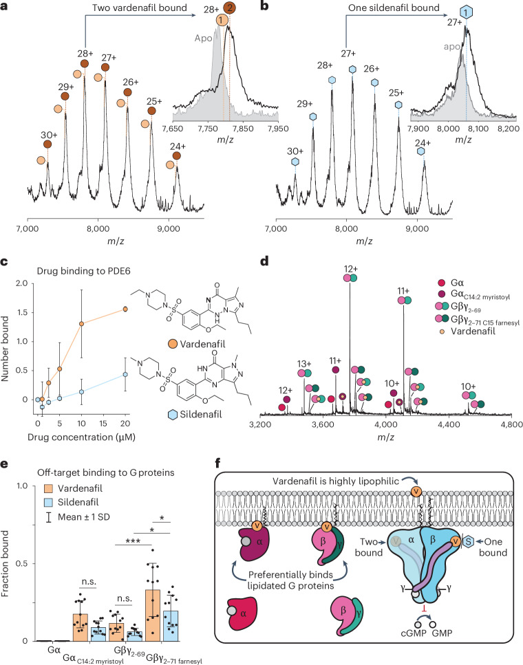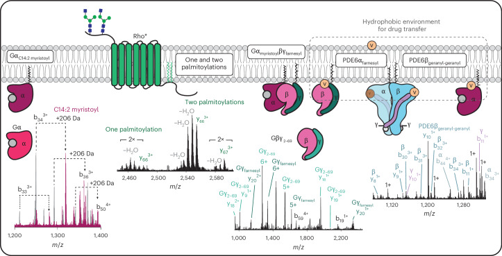 Understanding the dynamics of membrane protein-ligand interactions within a native lipid bilayer is a major goal for drug discovery. Typically, cell-based assays are used, however, they are often blind to the effects of protein modifications. In this study, using the archetypal G protein-coupled receptor rhodopsin, we found that the receptor and its effectors can be released directly from retina rod disc membranes using infrared irradiation in a mass spectrometer. Subsequent isolation and dissociation by infrared multiphoton dissociation enabled the sequencing of individual retina proteoforms. Specifically, we categorized distinct proteoforms of rhodopsin, localized labile palmitoylations, discovered a Gβγ proteoform that abolishes membrane association and defined lipid modifications on G proteins that influence their assembly. Given reports of undesirable side-effects involving vision, we characterized the off-target drug binding of two phosphodiesterase 5 inhibitors, vardenafil and sildenafil, to the retina rod phosphodiesterase 6 (PDE6). The results demonstrate differential off-target reactivity with PDE6 and an interaction preference for lipidated proteoforms of G proteins. In summary, this study highlights the opportunities for probing proteoform-ligand interactions within natural membrane environments.