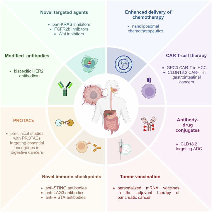 Cancers of the digestive system are major contributors to global cancer-associated morbidity and mortality, accounting for 35% of annual cases of cancer deaths. The etiologies, molecular features, and therapeutic management of these cancer entities are highly heterogeneous and complex. Over the last decade, genomic and functional studies have provided unprecedented insights into the biology of digestive cancers, identifying genetic drivers of tumor progression and key interaction points of tumor cells with the immune system. This knowledge is continuously translated into novel treatment concepts and targets, which are dynamically reshaping the therapeutic landscape of these tumors. In this review, we provide a concise overview of the etiology and molecular pathology of the six most common cancers of the digestive system, including esophageal, gastric, biliary tract, pancreatic, hepatocellular, and colorectal cancers. We comprehensively describe the current stage-dependent pharmacological management of these malignancies, including chemo-, targeted, and immunotherapy. For each cancer entity, we provide an overview of recent therapeutic advancements and research progress. Finally, we describe how novel insights into tumor heterogeneity and immune evasion deepen our understanding of therapy resistance and provide an outlook on innovative therapeutic strategies that will shape the future management of digestive cancers, including CAR-T cell therapy, novel antibody-drug conjugates and targeted therapies.