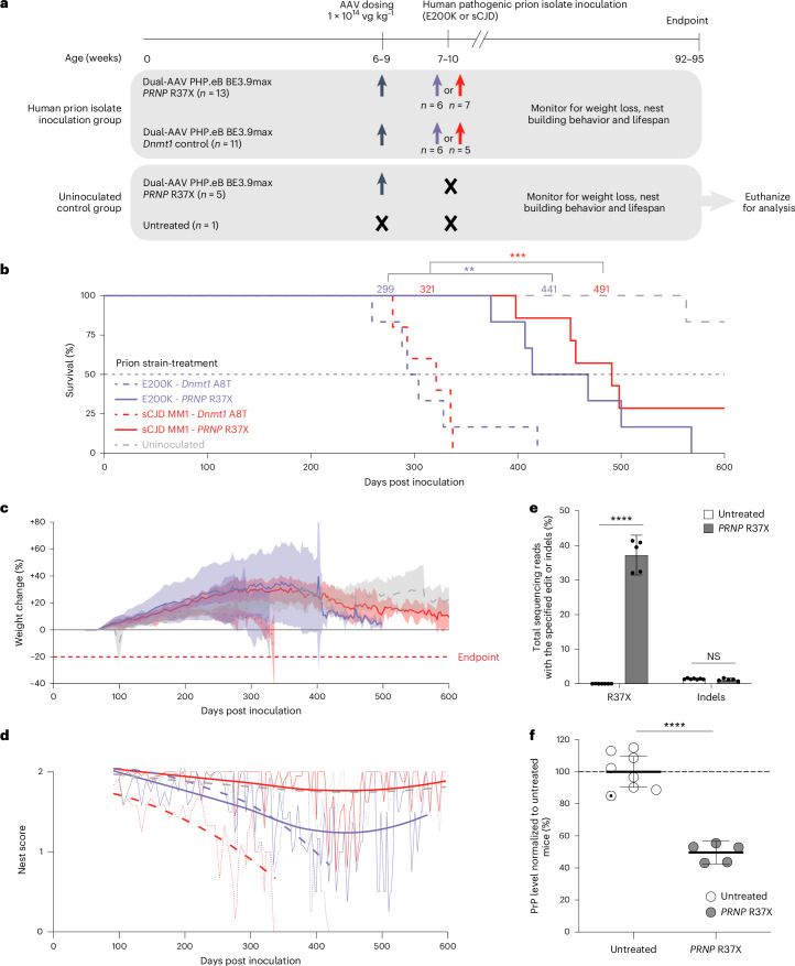 Competing interests: M.A., J.R.D., E.V.M., S.M.V. and D.R.L. are inventors on United States patent applications 63/700,235 and 63/718,534 relating to base editing for prion disease. D.R.L. is a consultant and/or equity owner of Prime Medicine, Beam Therapeutics, Pairwise Plants, Exo Therapeutics, Nvelop Therapeutics and Chroma Medicine, some of which are companies that use or deliver genome editing or epigenome-modulating agents. J.R.D., J.M.L. and W.-H.Y. are current employees of Prime Medicine. S.M.V. acknowledges speaking fees from Abbvie, Biogen, Eli Lilly, Illumina and Ultragenyx; consulting fees from Alnylam and Invitae; and research support from Eli Lilly, Gate Bio, Ionis and Sangamo. E.V.M. acknowledges speaking fees from Abbvie, Eli Lilly and Vertex; consulting fees from Alnylam and Deerfield; and research support from Eli Lilly, Gate Bio, Ionis and Sangamo. B.E.D. declares outside interest in Apertura Gene Therapy and Tevard Biosciences and is an inventor on US patent application US11499165B2 relating to the PHP.eB AAV capsid. All other authors declare no competing interests.