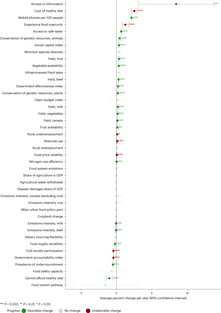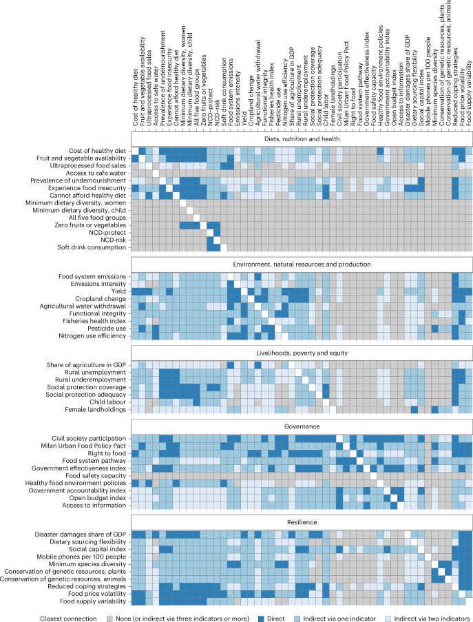 Due to complex interactions, changes in any one area of food systems are likely to impact-and possibly depend on-changes in other areas. Here we present the first annual monitoring update of the indicator framework proposed by the Food Systems Countdown Initiative, with new qualitative analysis elucidating interactions across indicators. Since 2000, we find that 20 of 42 indicators with time series have been trending in a desirable direction, indicating modest positive change. Qualitative expert elicitation assessed governance and resilience indicators to be most connected to other indicators across themes, highlighting entry points for action-particularly governance action. Literature review and country case studies add context to the assessed interactions across diets, environment, livelihoods, governance and resilience indicators, helping different actors understand and navigate food systems towards desirable change.