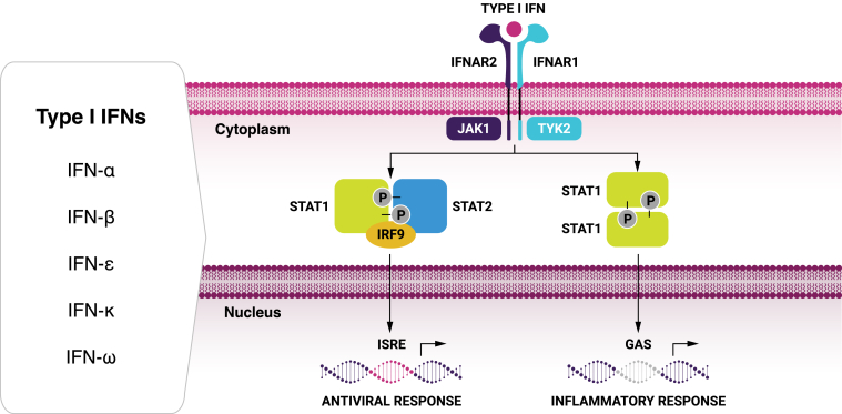Type I interferons (IFNs) are immunostimulatory molecules that can activate the innate and adaptive immune systems. In cases of immune dysfunction, prolonged activation of the type I IFN pathway has been correlated with kidney tissue damage in a wide range of kidney disorders, such as lupus nephritis (LN) and focal segmental glomerulosclerosis (FSGS). Genetic mutations, such as APOL1 risk variants in conjunction with elevated type I IFN expression, are also associated with higher rates of chronic kidney disease in patients with LN and collapsing FSGS. Long-term activation of the type I IFN pathway can result in chronic inflammation, leading to kidney tissue damage, cell death, and decline in organ function. Thus, therapeutic strategies targeting type I IFN could provide clinical benefits to patients with immune dysregulation who are at risk of developing impaired kidney function. Here, we present a critical review of type I IFN signaling, the consequences of chronically elevated type I IFN expression, and therapeutic strategies targeting type I IFN signaling in the context of kidney disease.