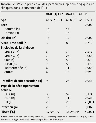 Conclusion: Our study showed that the prevalence of ACLF was 37 %. The main predictive factor of ACLF was creatinine level. The mortality rate was high at 65 %.