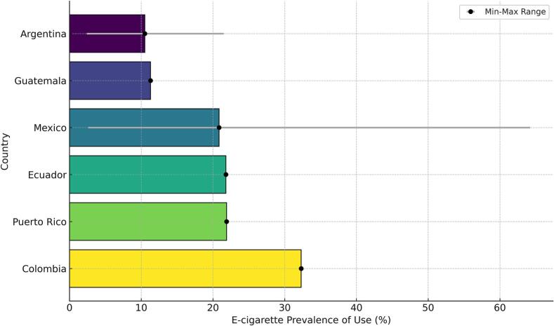 Results: The prevalence of e-cigarette among adolescents in six Latin American countries ranged from 2.6 % to 64.2 %, with a pooled mean prevalence of 18.9 %, and lifetime use higher than current use. Key associated factors included male sex, concurrent use of tobacco and other substances, social influences, and exposure to online advertising. A widespread lack of knowledge regarding e-cigarette risks, coupled with limited regulatory oversight, may be contributing to higher usage rates.