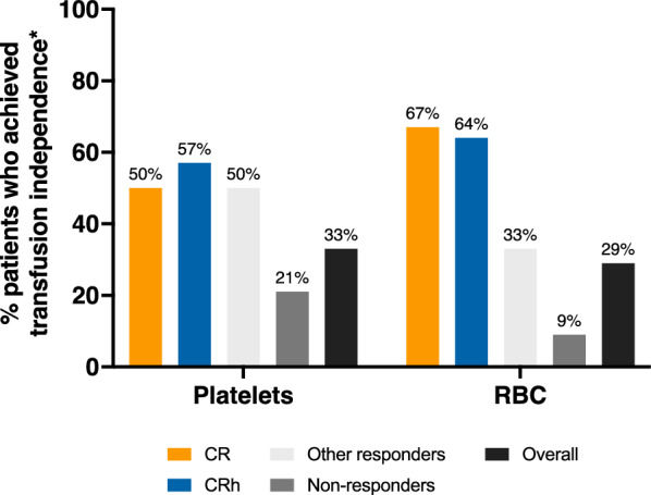 Results: Sixty-seven patients with R/R mIDH1R132 AML received combination OLU + AZA. Median age was 66 years (range 28-82) and 54% were male. Most patients (83%) had 2 + prior regimens, including a hypomethylating agent in 40%, IDH1 inhibitor therapy in 31% (olutasidenib in 24%), and hematopoietic stem cell transplant in 10%. Cytogenetic risk was intermediate in 72%, poor in 18% and unknown in 10%. CR/CRh was achieved in 21/67 (31%; 95% CI 21-44) patients, with a median duration of 14.7 months (95% CI 4.6-not reached). CR was achieved in 18/67 (27%; 95% CI 17-39) patients, with median duration of 20.3 months (95% CI 3.7-not reached). Overall response (partial remission or better) was achieved in 34/67 (51%; 95% CI 38-63) patients. Median overall survival was 12.9 months (95% CI 18.7-19.3). In a subset analysis excluding patients who had prior OLU exposure (N = 51), CR/CRh was achieved in 19/51 (37%; 95% CI 24-52) patients, CR was achieved in 16/51 (31%; 95% CI 19-46), and overall response was achieved in 30/51 (59%; 95% CI 44-72). In patients who achieved CR/CRh and were transfusion-dependent at baseline, transfusion independence (RBC and platelets) was achieved in 64% (7/11) and 57% (4/7) of patients, respectively. The most common Grade 3 or 4 adverse events (> 20% patients) were decreased platelet count (37%), red blood cell count (25%), and neutrophil count (24%). Six patients (9%) experienced differentiation syndrome. Four (6%) discontinued treatment due to an adverse event.