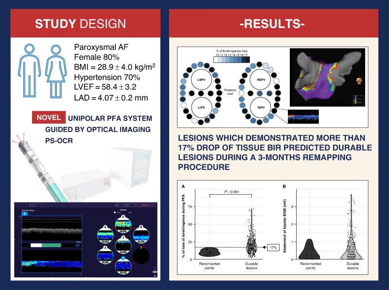 Methods and results: Patients with paroxysmal atrial fibrillation underwent pulmonary vein isolation (PVI) using PFA (AblaView®, MedLumics). Using polarization-sensitive optical coherence reflectometry (PS-OCR), reflective characteristics of myocardial tissue and visualization of real-time contrast between healthy tissue and ablated tissue using a drop in tissue birefringence (BiR) was assessed. Wide antral PVI was performed using single point irrigated PFA (unipolar, 1800V, 3 trains, 21 s). Remapping was performed at 3 months. Primary efficacy outcome was the ability of PS-OCR to predict lesion durability at 3-month remapping. Serious adverse events were recorded. Ten patients were included. In total, 38/40 PVs could be isolated with the system. The mean drop of BiR was 17.3 ± 11.5%. Dragging across the ablation lines showed a persistent drop in BiR. During the remap procedures (8/10 patients ablated only with PFA), 12 PVs (37.5%) were found to be electrically reconnected. The mean loss of BiR during all PFA for durable lesions was 20.9%, while only 10.1% BiR loss was observed during the index ablation for reconnected areas (P < 0.001). None of the points with ≥17% loss of birefringence was found to be reconnected.