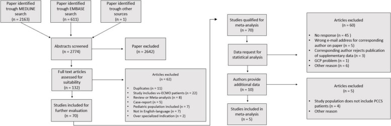 Methods: MEDLINE and EMBASE were searched for studies in English, published between January 1st 2000 and January 16th 2023, reporting mortality and morbidity in patients aged ≥ 18 treated with ECLS for PCCS. Supplementary data were requested from the respective corresponding authors. Outcomes were weaning from extracorporeal life support, hospital survival and complications.
