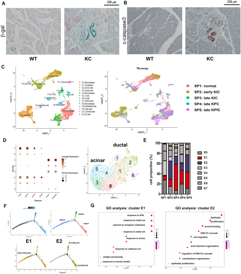 Background and aims: Oncogenic KRAS mutations are present in approximately 90% of pancreatic ductal adenocarcinoma (PDAC). However, Kras mutation alone is insufficient to transform precancerous cells into metastatic PDAC. This study investigates how KRAS-mutated epithelial cells acquire the capacity to escape senescence or even immune clearance, thereby progressing to advanced PDAC.